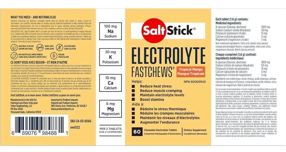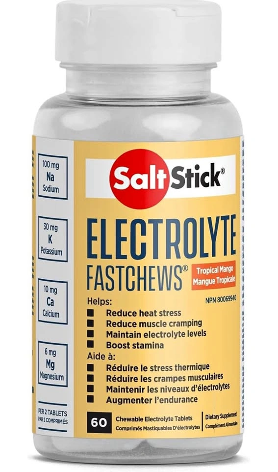 10Had about 5, but selling because I don't like the taste. SaltStick Electrolyte FastChews - Chewable Electrolyte Tablets CHEWABLE ELECTROLYTE TABLETS: SaltStick FastChews are chewable bite-sized electrolyte tablets packed with sodium, potassium, calcium, and magnesium. These electrolyte supplements were designed to replace the essential electrolytes lost through sweat to keep the body hydrated during endurance workouts. ELECTROLYTES THAT WORK ALMOST INSTANTLY: These electrolyte tablets are designed to dissolve quickly, faster than the leading sports drink or electrolyte powder. Just chew it and feel the difference. SPORT ELECTROLYTE SUPPLEMENT: Perfect for any sport where you sweat! Whether you need electrolytes as part of your endurance training and running essentials kit or you're playing intense sports like tennis, basketball or soccer, these chewable tablets will be your new favorite sports nutrition supplement! Simply chew and enjoy! HOW TO USE: Just Chew It! Chew the tablets to replace the electrolytes lost through sweat. FastChews are a low-calorie electrolyte supplement to simply provide electrolytes with none of the extra stuff. CLEAN AND SIMPLE INGREDIENTS: Sodium (as sodium citrate), Potassium (as potassium citrate), Calcium (as calcium gluconate), and Magnesium (as magnesium citrate). Made in the USA. Non-GMO, Vegan, and Gluten Free.