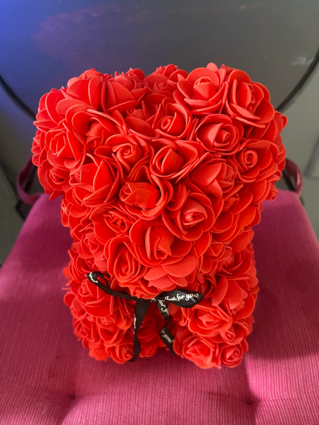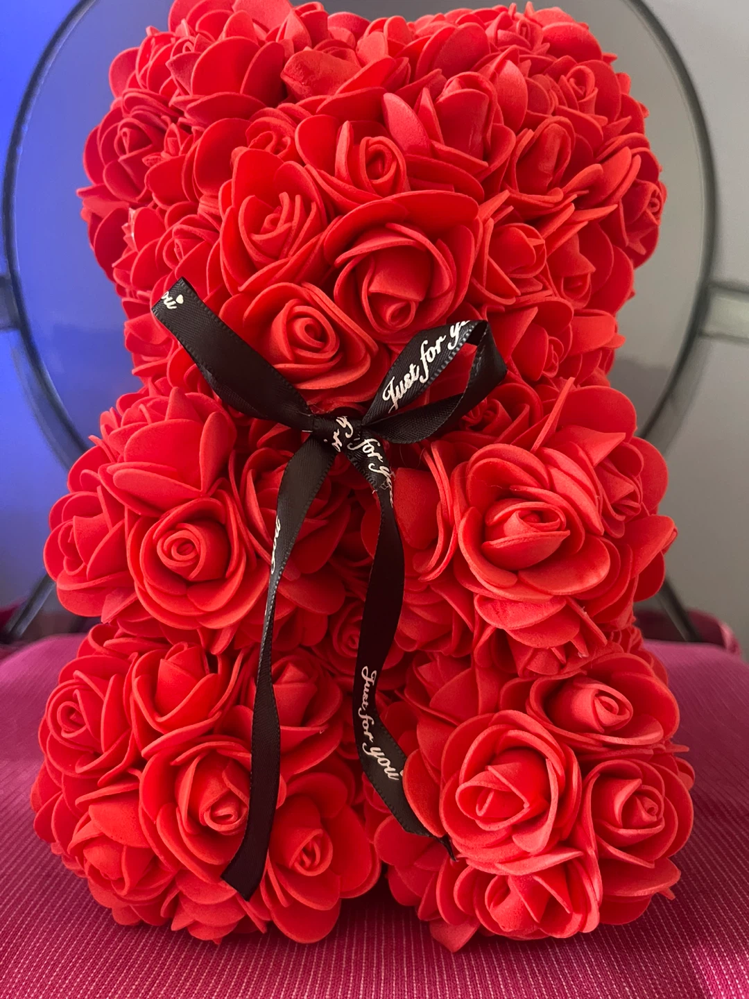 Selling a brand new red rose teddy bear! This adorable bear is made of artificial roses and tied with a black ribbon that says "Just for you". It's a perfect gift for any occasion