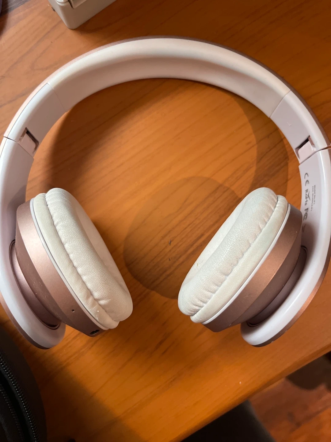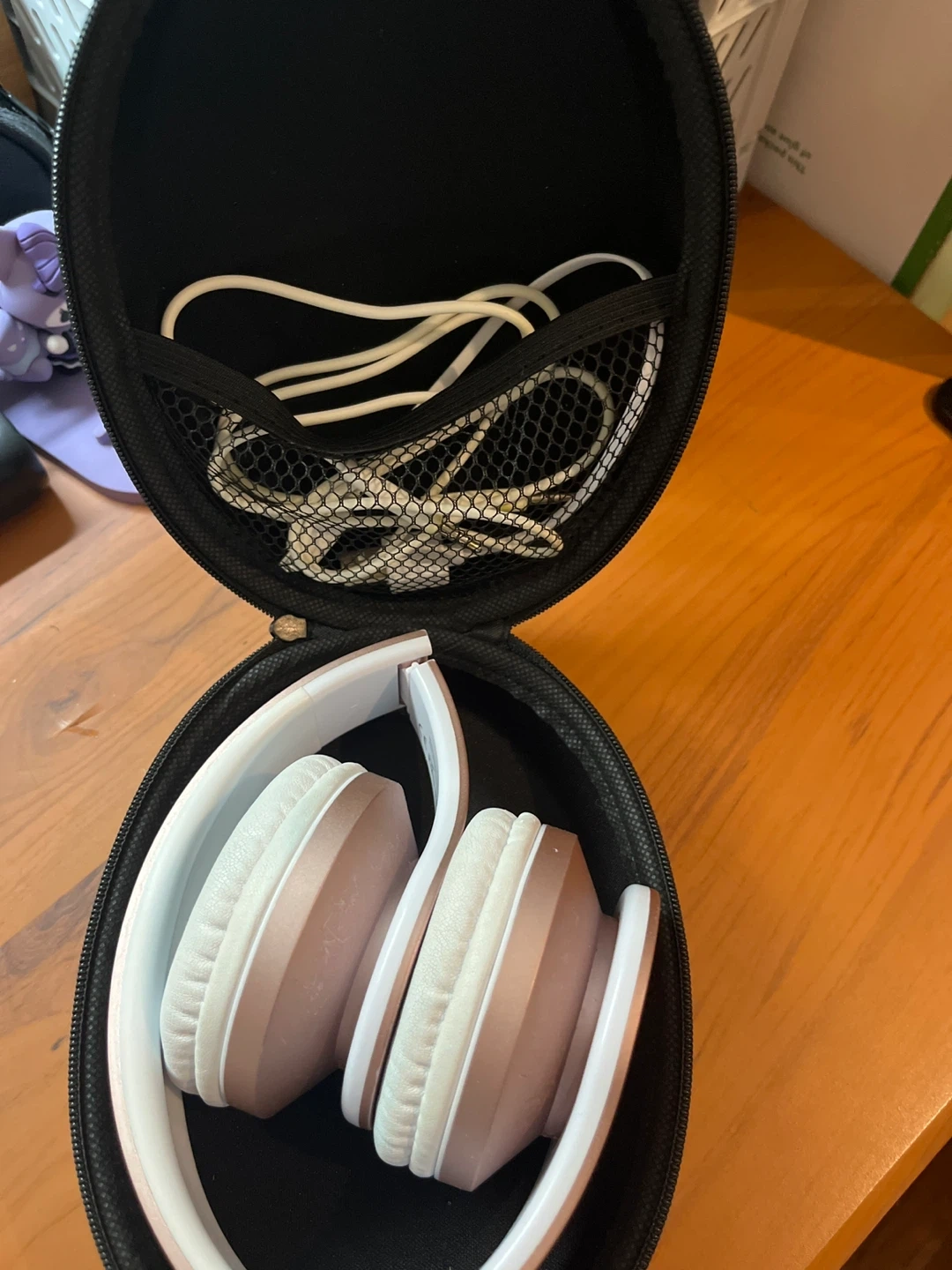 Selling a pair of PowerLocus wireless Bluetooth headphones in pink. They come with a carrying case and a cable. Great for listening to music or podcasts on the go!