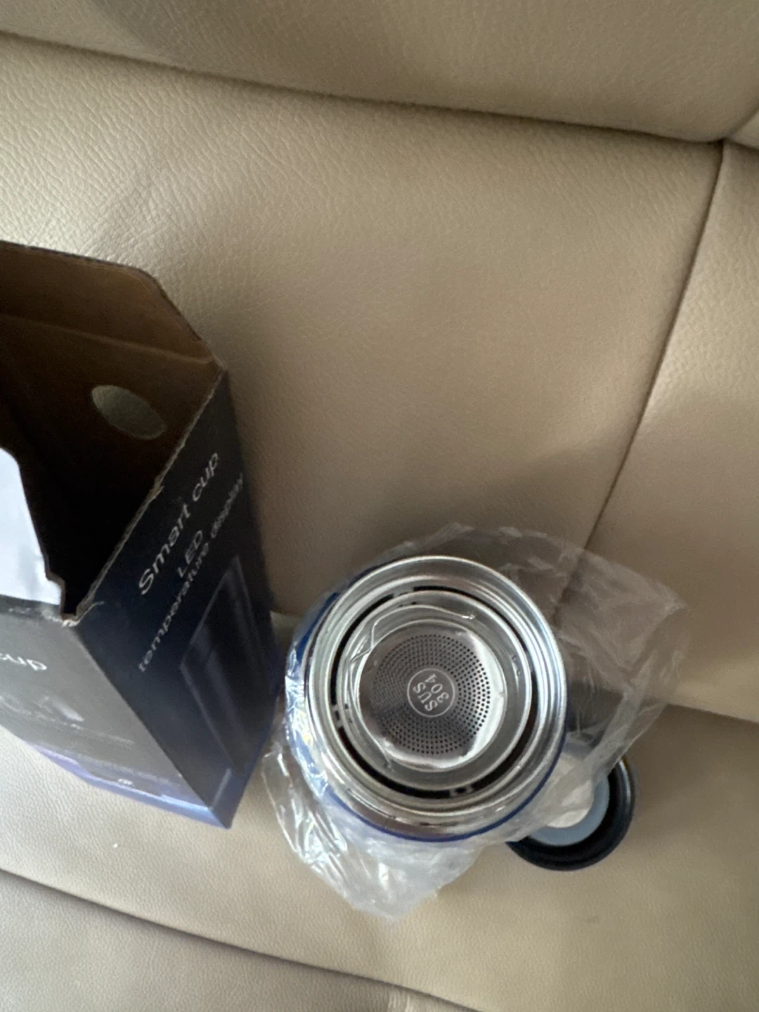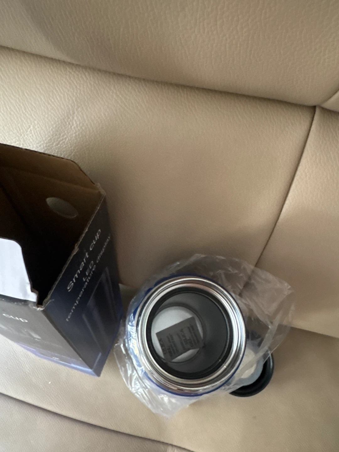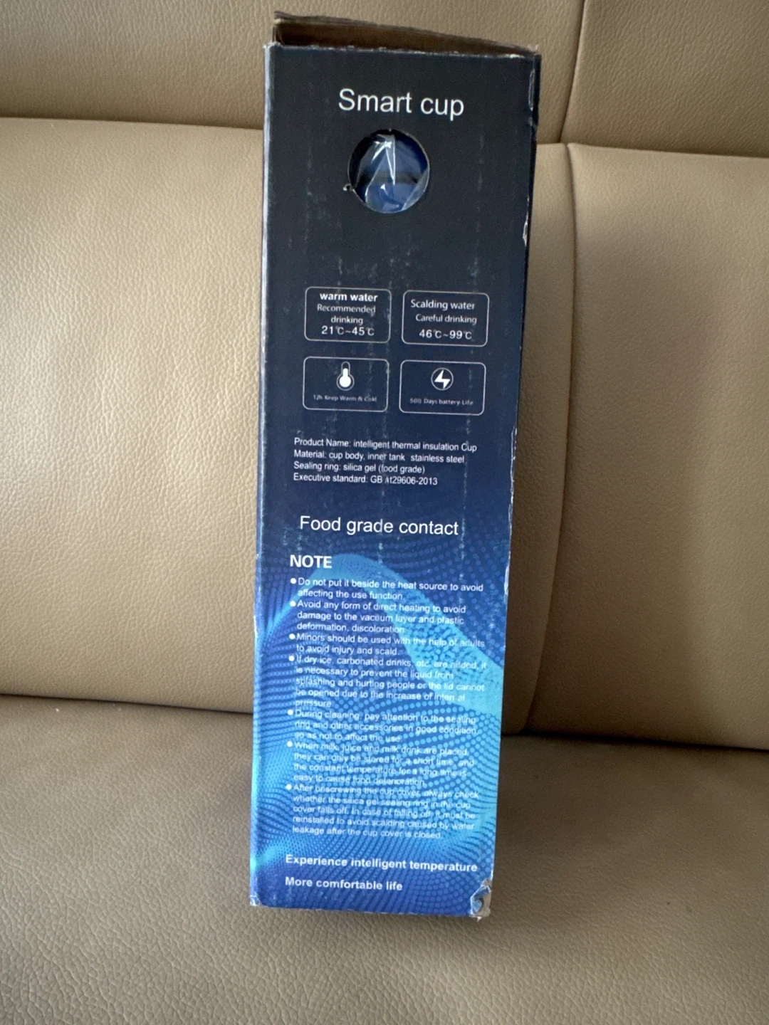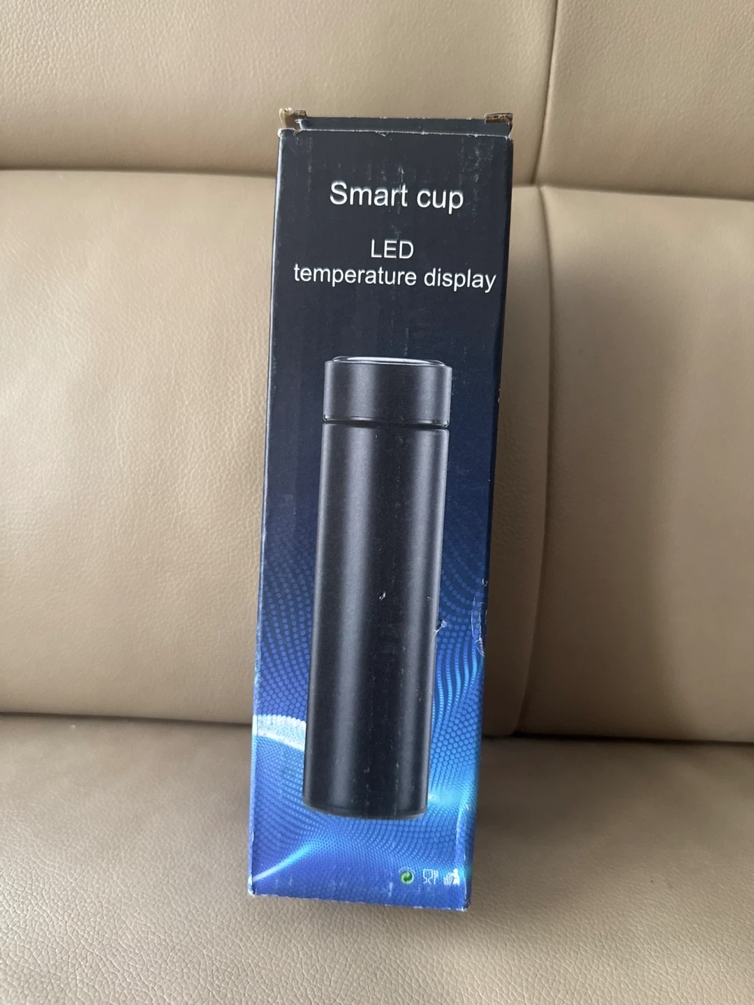 Brand new smart cup with LED temperature display. It's blue and comes with its original box. This intelligent thermal insulation cup is made with a stainless steel inner tank. It's designed to keep all temperatures of water for up to 12 h. The length is 9 inches. It does however have a person’s name on both sides of the bottle.