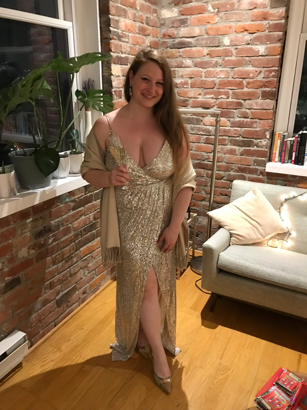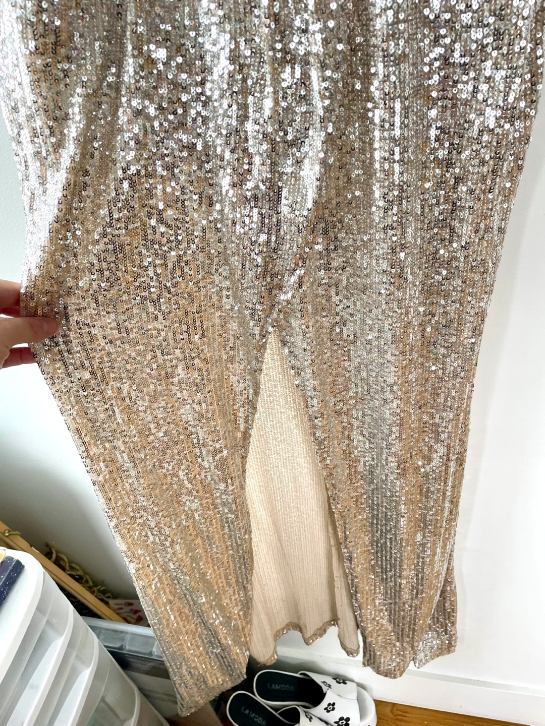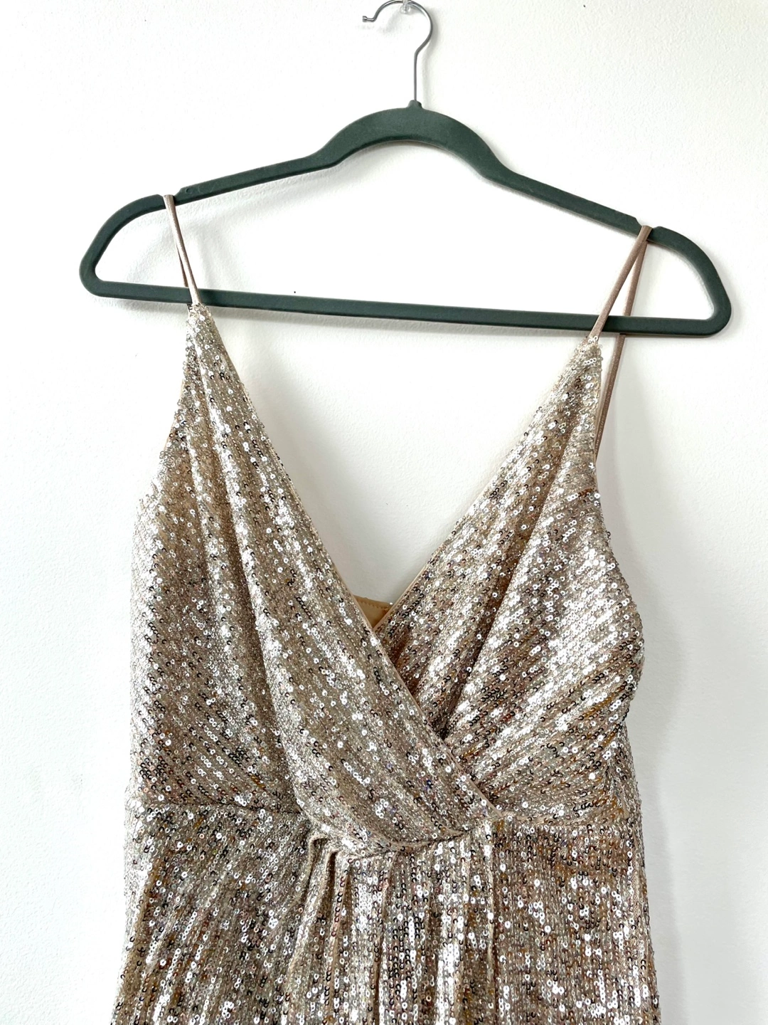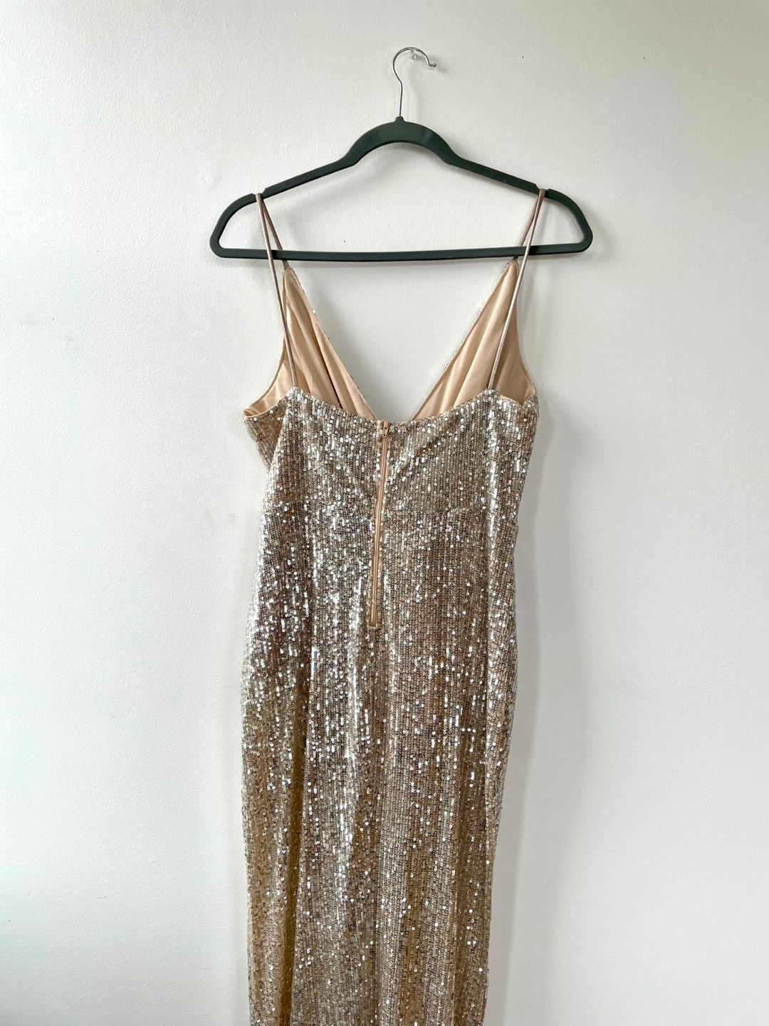Like-New Champagne / Gold Sequin dress, slit in the middle, body suit underneath, and zip back. Worn twice.