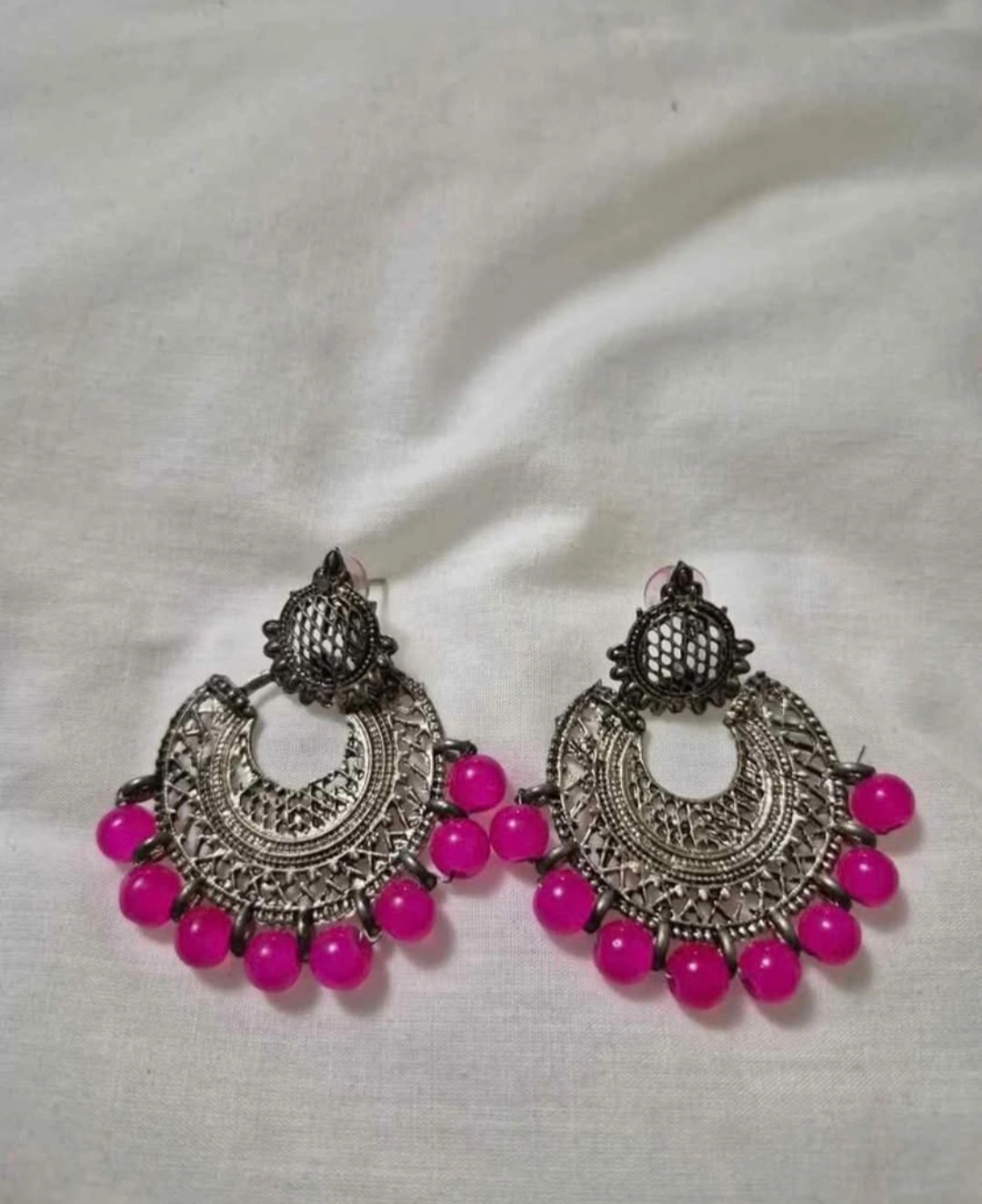 18These are a pair of silver coloured dangle earrings with pink beads. They have a unique design and would be a great addition to any jewelry collection!