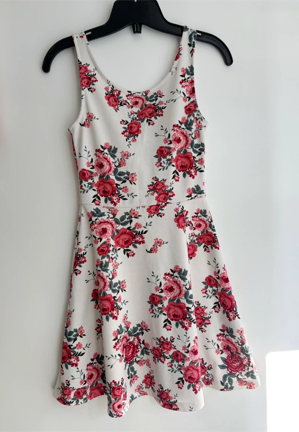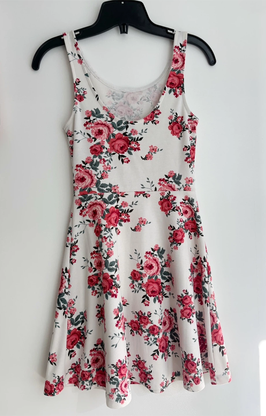A cute floral print dress is up for grabs! It features a white background with a vibrant red rose pattern. It has a flare skirt and it’s super flattering. Perfect for a sunny day out or a special occasion.