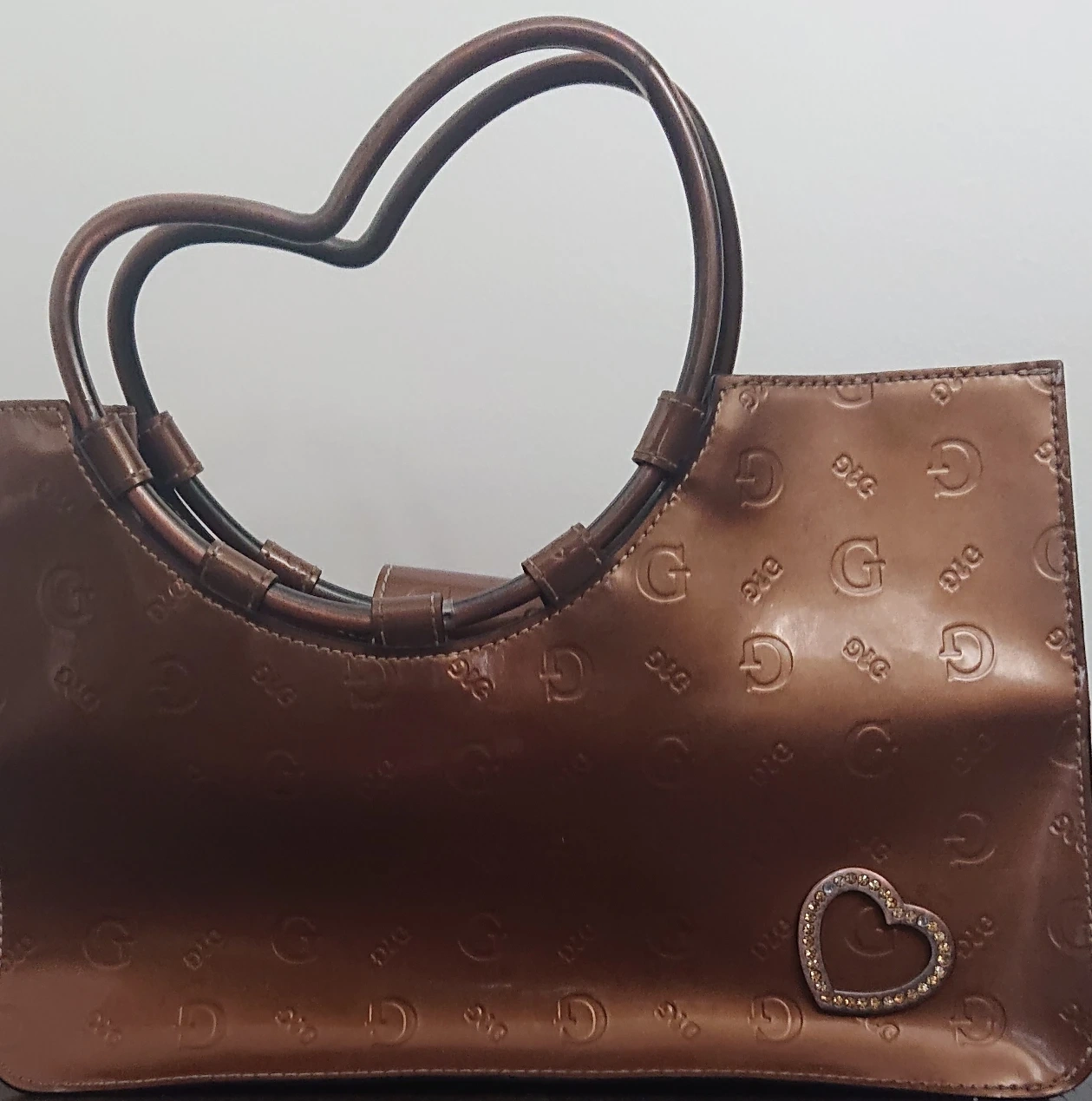 Check out this Guess tote bag! It features a unique heart-shaped handle and an embossed design with the Guess logo. It's a stylish bag in great condition.