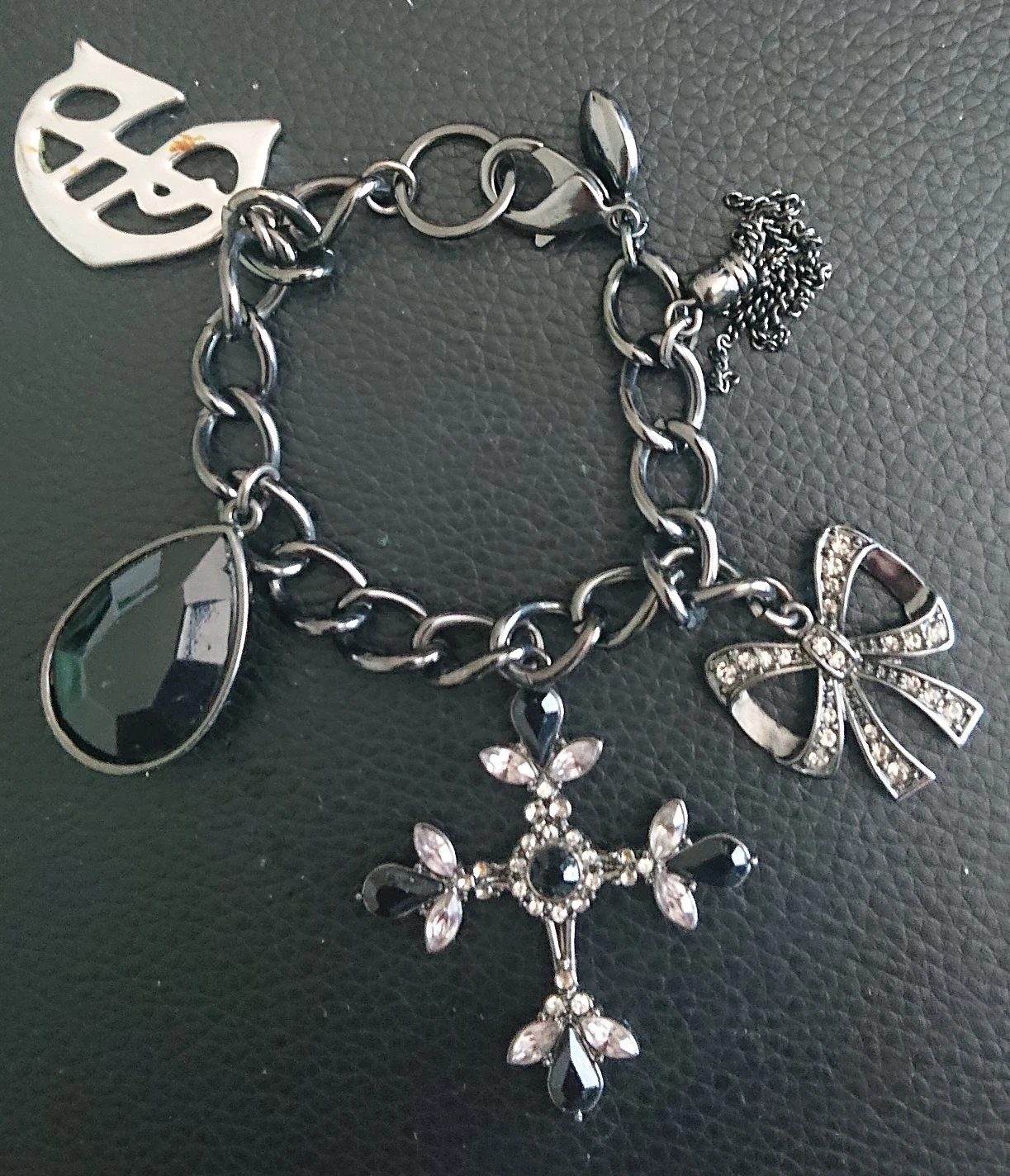 A bracelet with a heart shape embedded with crystals; a chain bracelet with crystal decorated cross, butterfly tie, etc. A heart shaped ring, a pair of ear ring