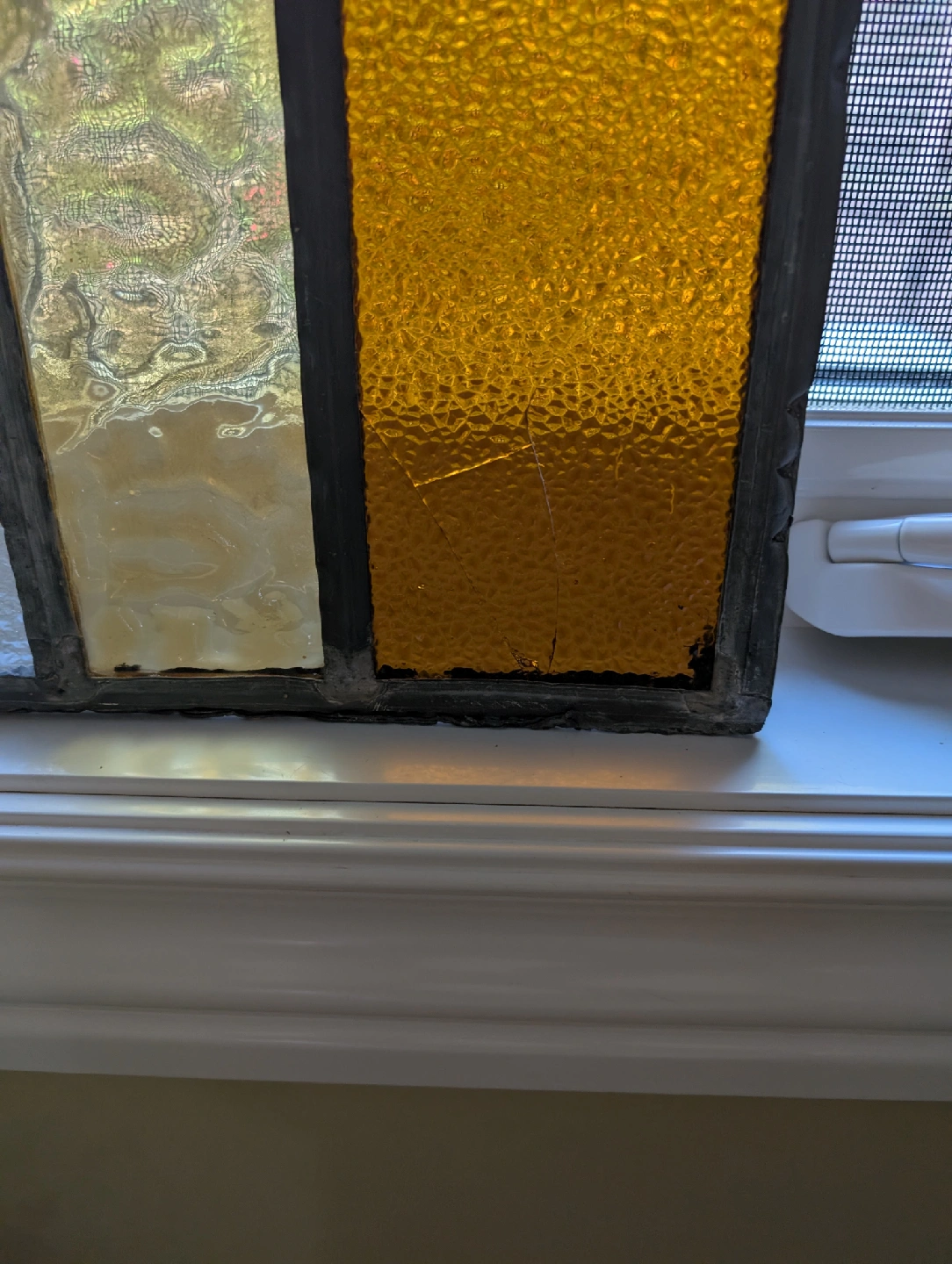 Stained glass window panel featuring a multicoloured geometric design. The panel has a silver frame and is in good condition. It would make a great addition to any home! Some cracks as shown.