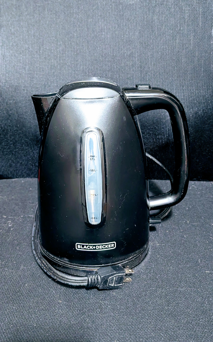Black+Decker electric kettle in black! It has a 1.7L capacity. Perfect for quickly boiling water for tea, coffee, or anything else you need. Great condition!