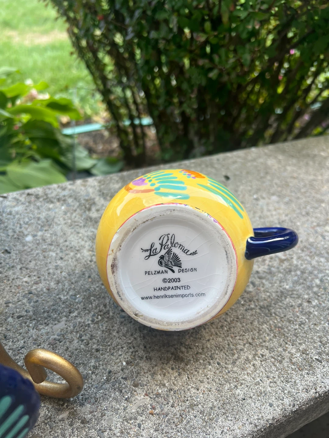 Unique, handpainted La Paloma Pelzman Design set! Includes a two-tiered serving stand, a teapot, creamer, and adorable bird-shaped salt and pepper shakers. The vibrant colours and floral designs add a touch of whimsy to any table setting. Plates are hand painted in Italy!