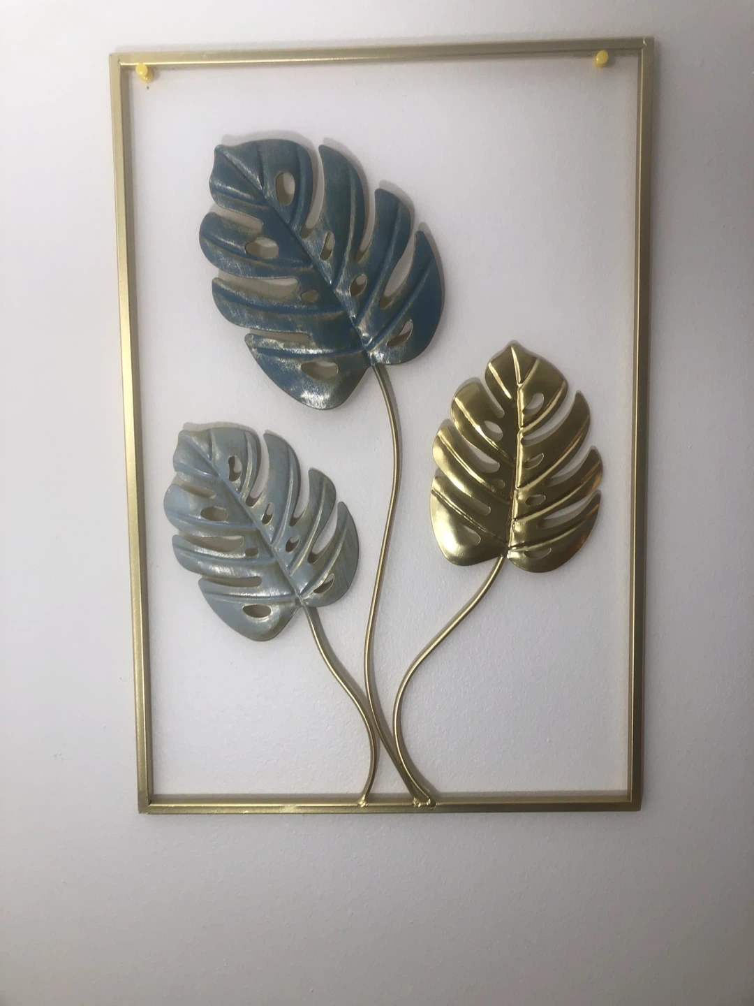 181Add a touch of nature to your home with this metal monstera leaf wall art! It features three leaves in blue and gold tones, framed in a gold metal square. Perfect for adding a modern and stylish accent to any room