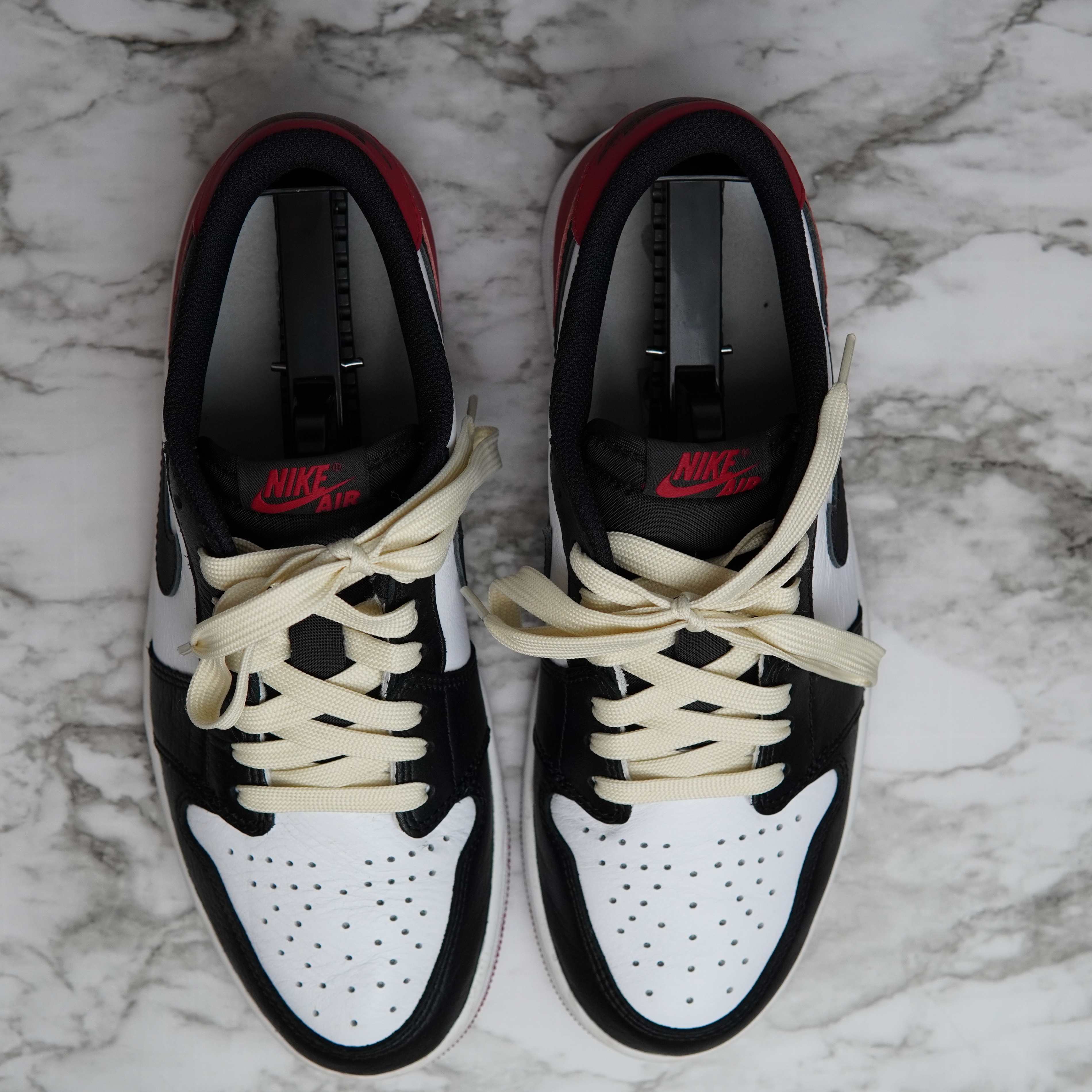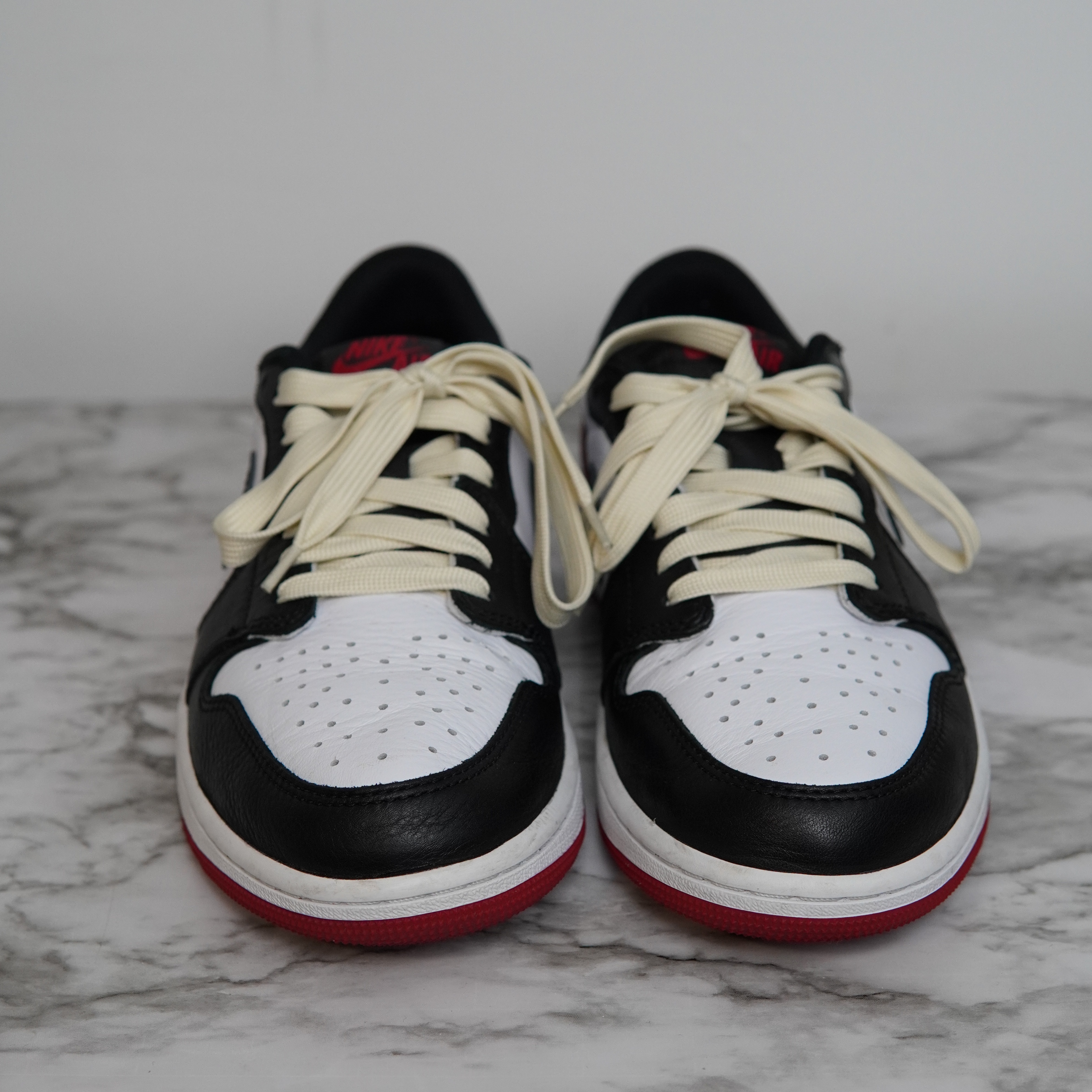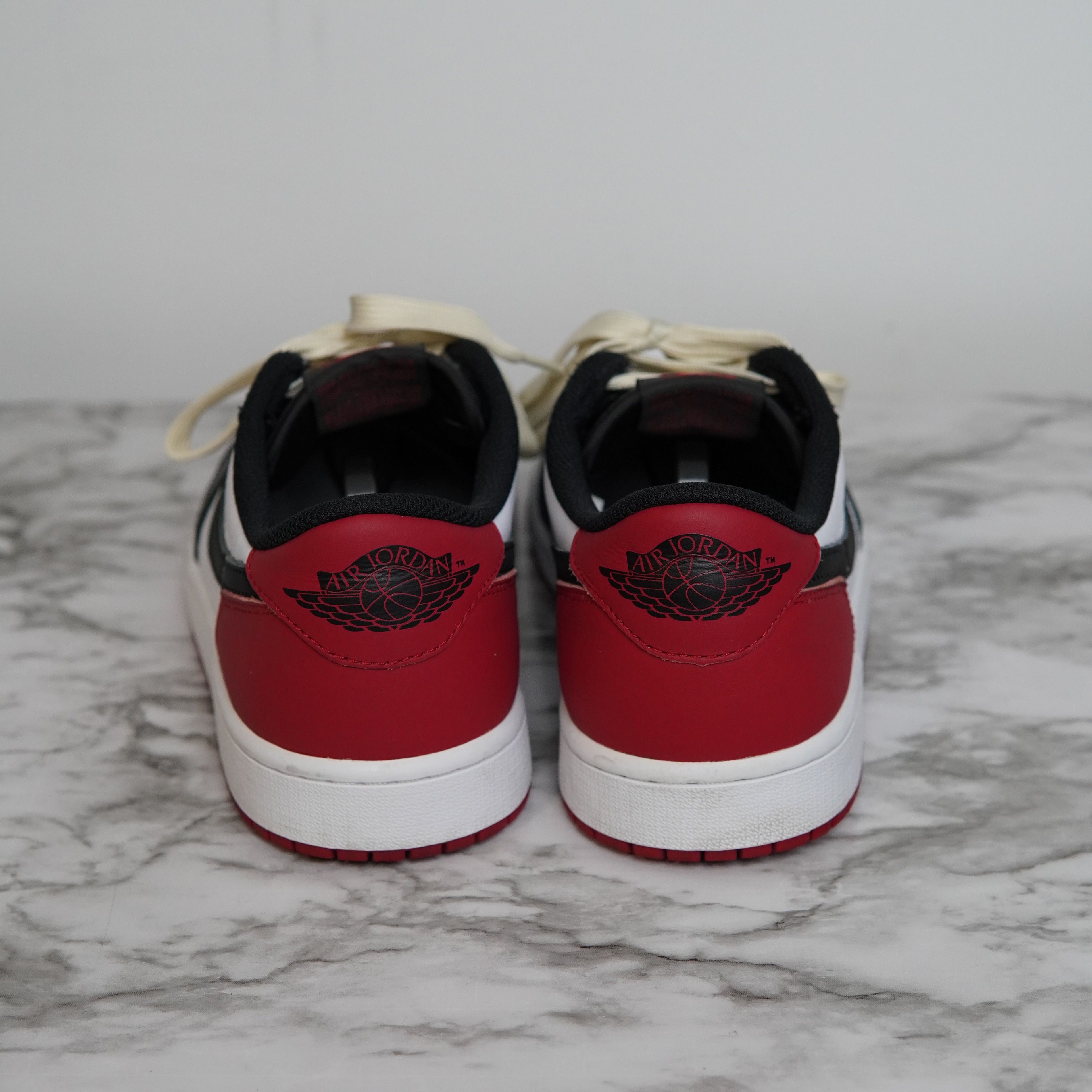Features leather upper, rubber sole, and iconic AJ1 silhouette.