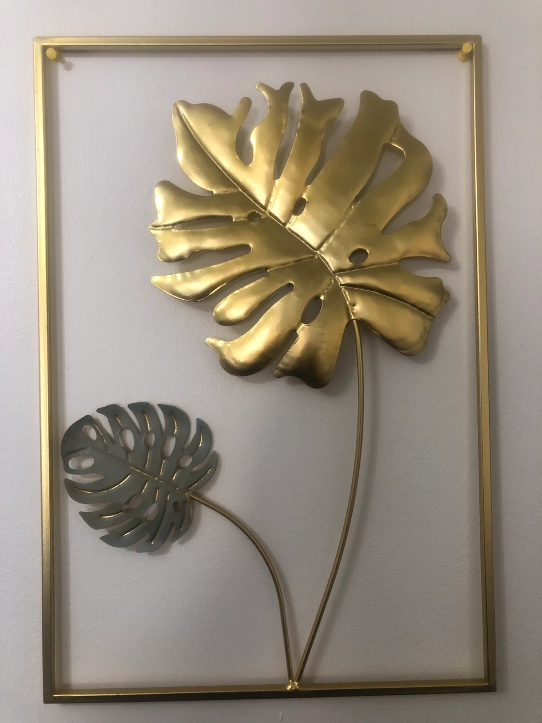 181Add a touch of modern elegance to your home with this metal monstera leaf wall art! It features a gold frame with a large gold leaf and a smaller silver leaf. Perfect for adding a stylish accent to any room