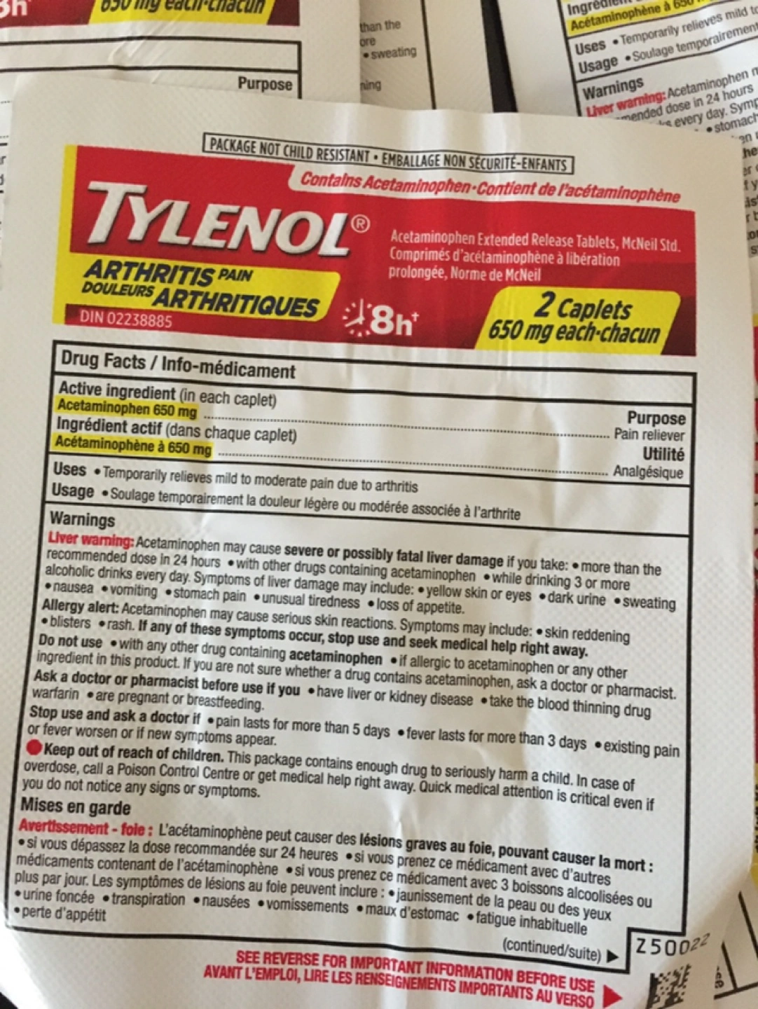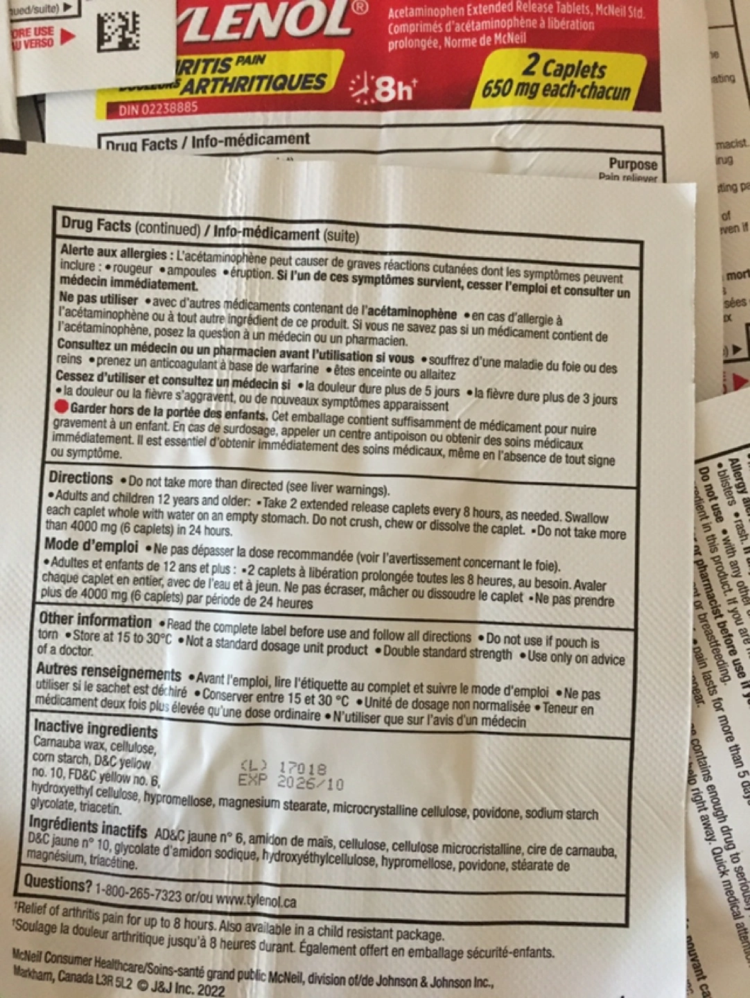 Selling individual packets of Tylenol Arthritis Pain. Each packet contains 2 caplets of 650mg acetaminophen extended release tablets. Expiry date is 2026 October. Price for each pack has 2 caplets Pick up:toronto down town west(adelaide and niagara)