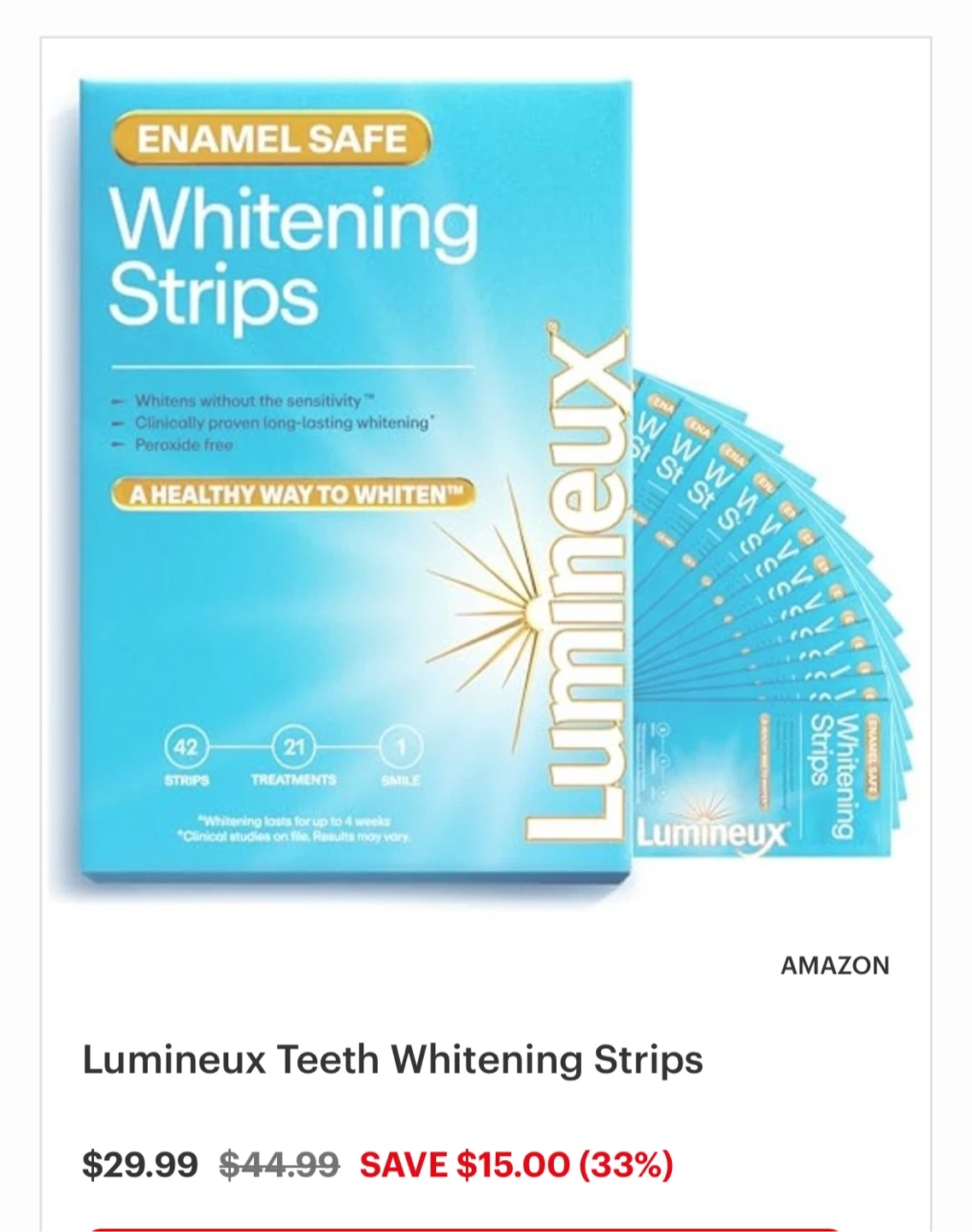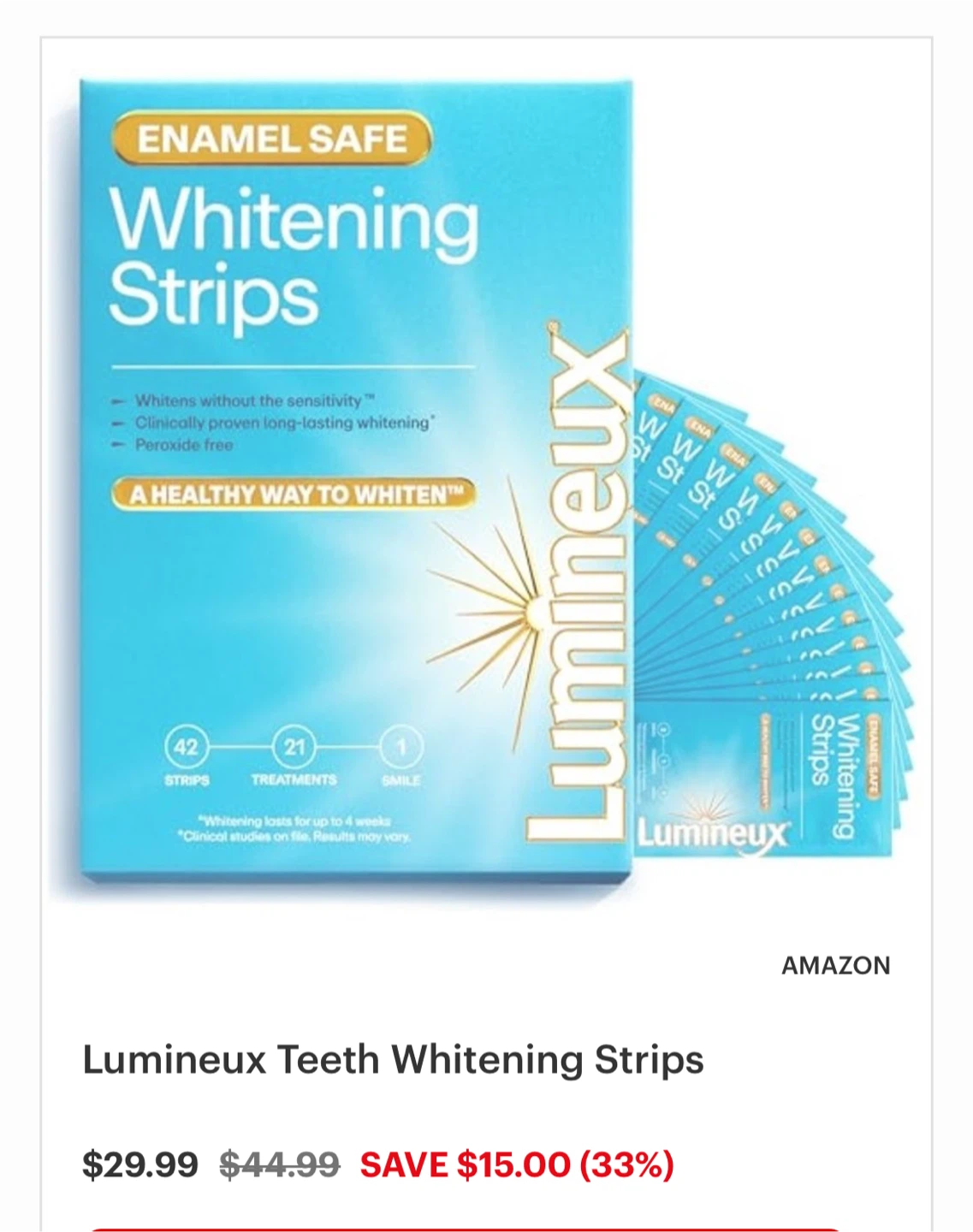 Selling a box of Lumineux Whitening Strips! These are enamel safe and whiten without the sensitivity. Each box contains 42 strips for 21 treatments. Originally bought for $44.99!