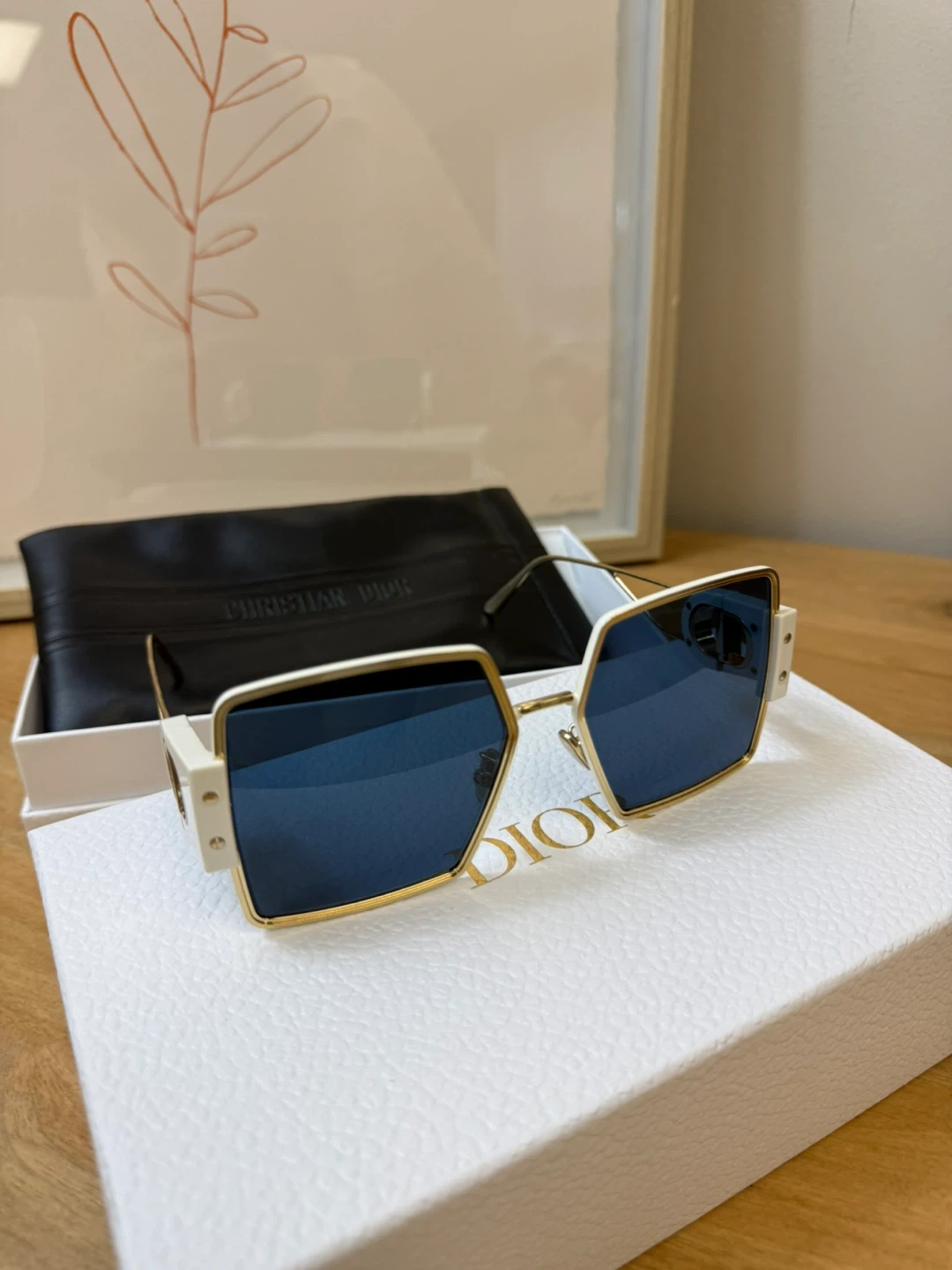Selling a pair of Christian Dior sunglasses. They come with the original box and case. The sunglasses have a unique design with white and gold accents. They are in great condition and ready for a new owner!