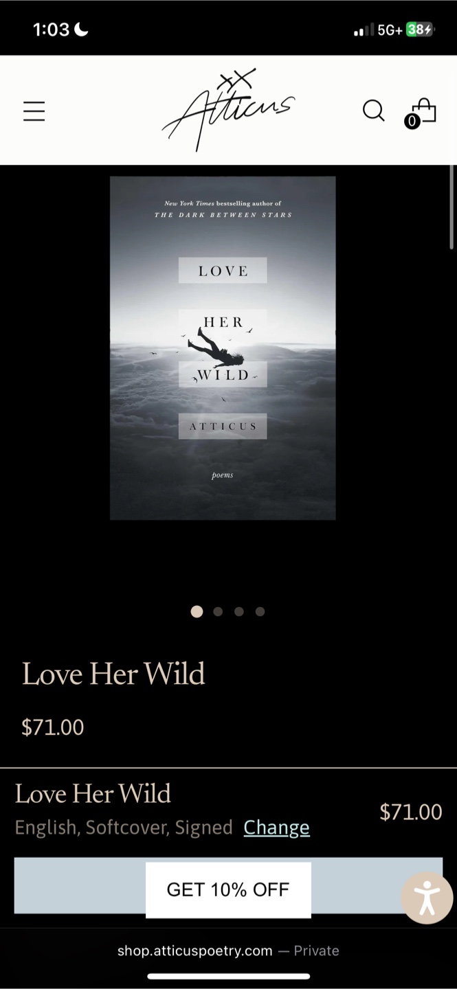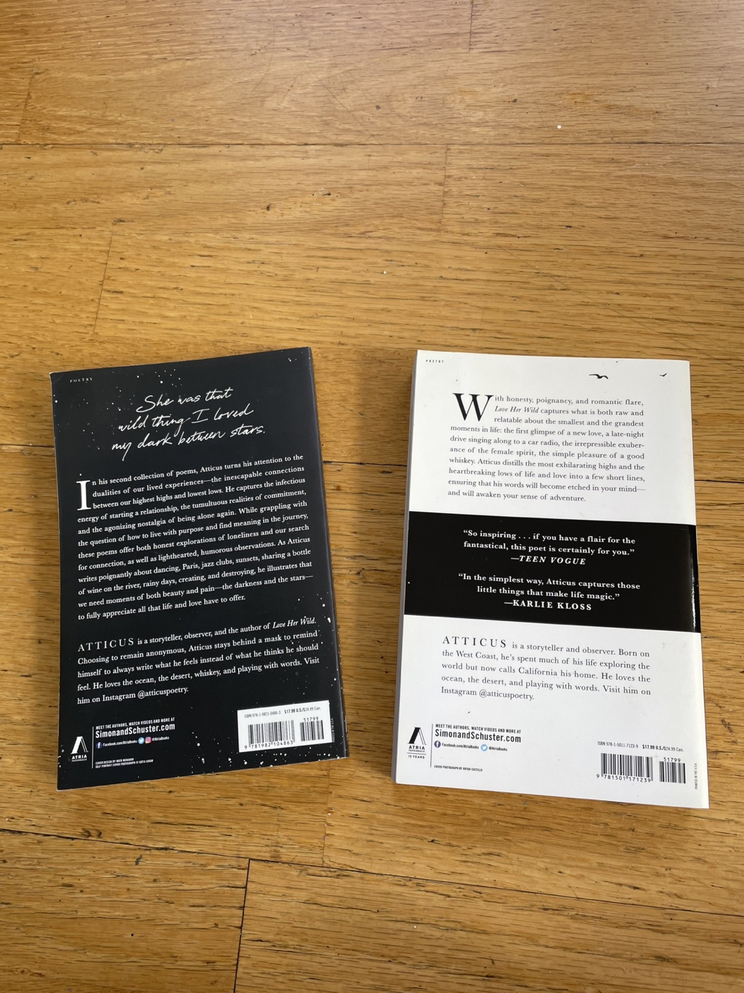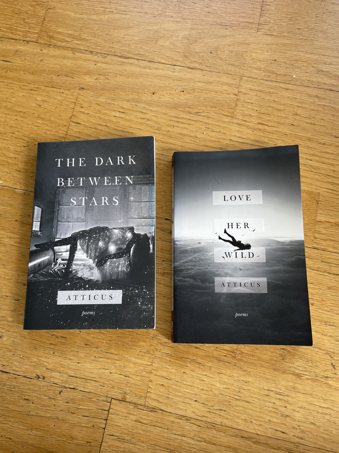 Two signed copies of Atticus poetry books - “Love Her Wild” signed and “The Dark Between Stars” signed with a name and “stay wild”.