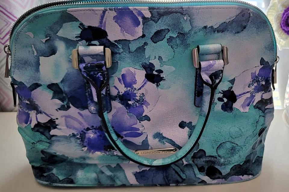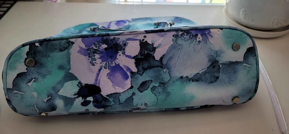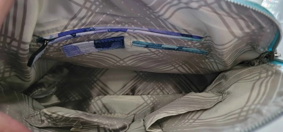Inside the bag: 1 zippered pocket, 3 smaller pockets and the brand tag.