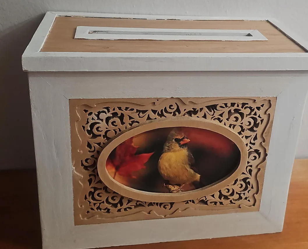 Here's a charming handmade wooden box! It features a unique bird design and a slot on top. Perfect for storing small items or using as a decorative piece