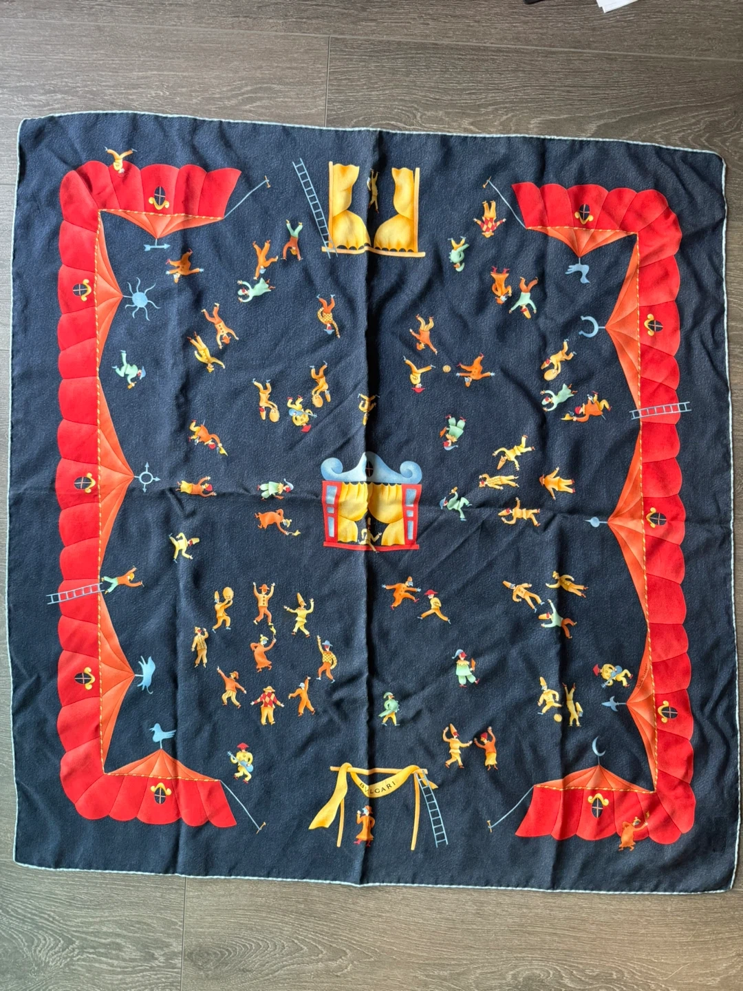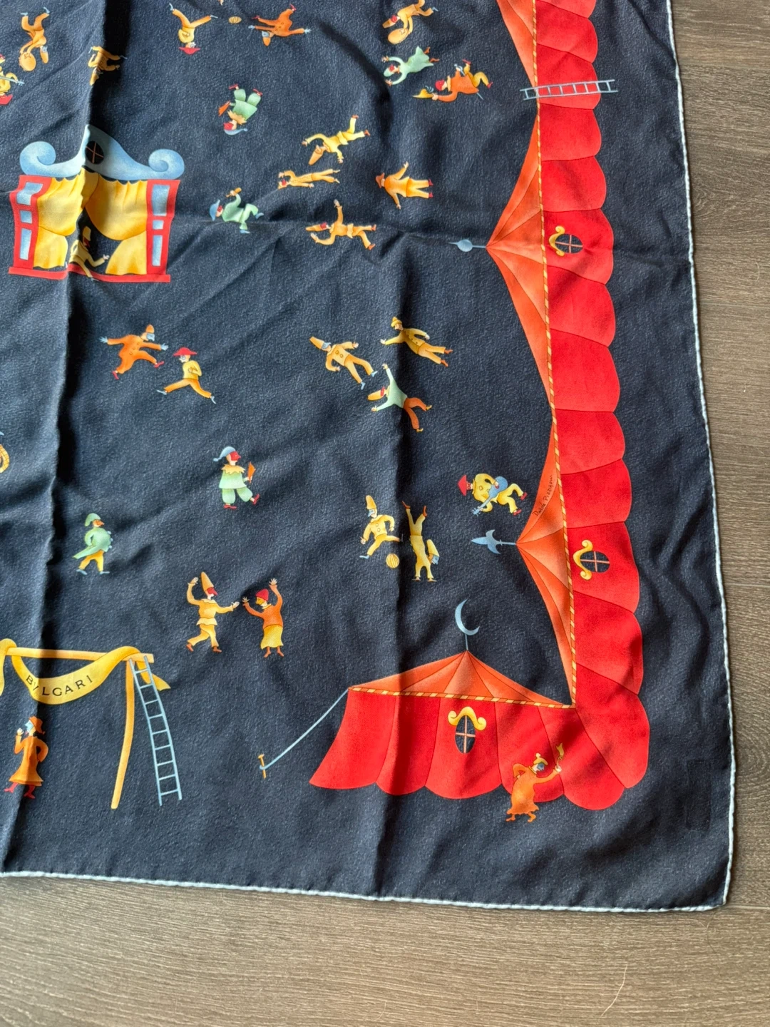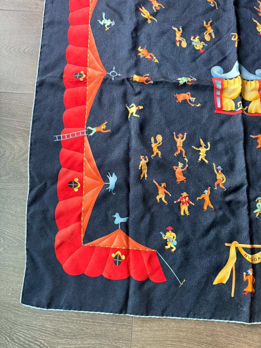Selling a Bvlgari silk scarf with a unique circus-themed design. The scarf features playful imagery of performers and tents. It's in good condition and ready to add a touch of whimsy to your wardrobe!