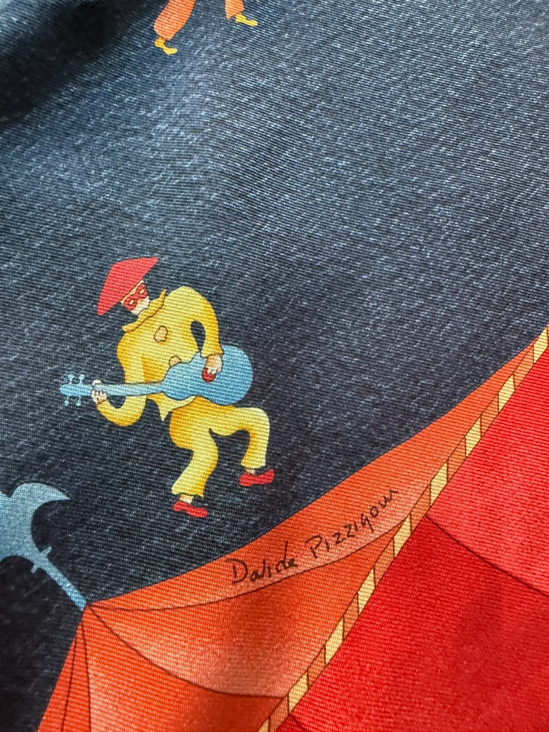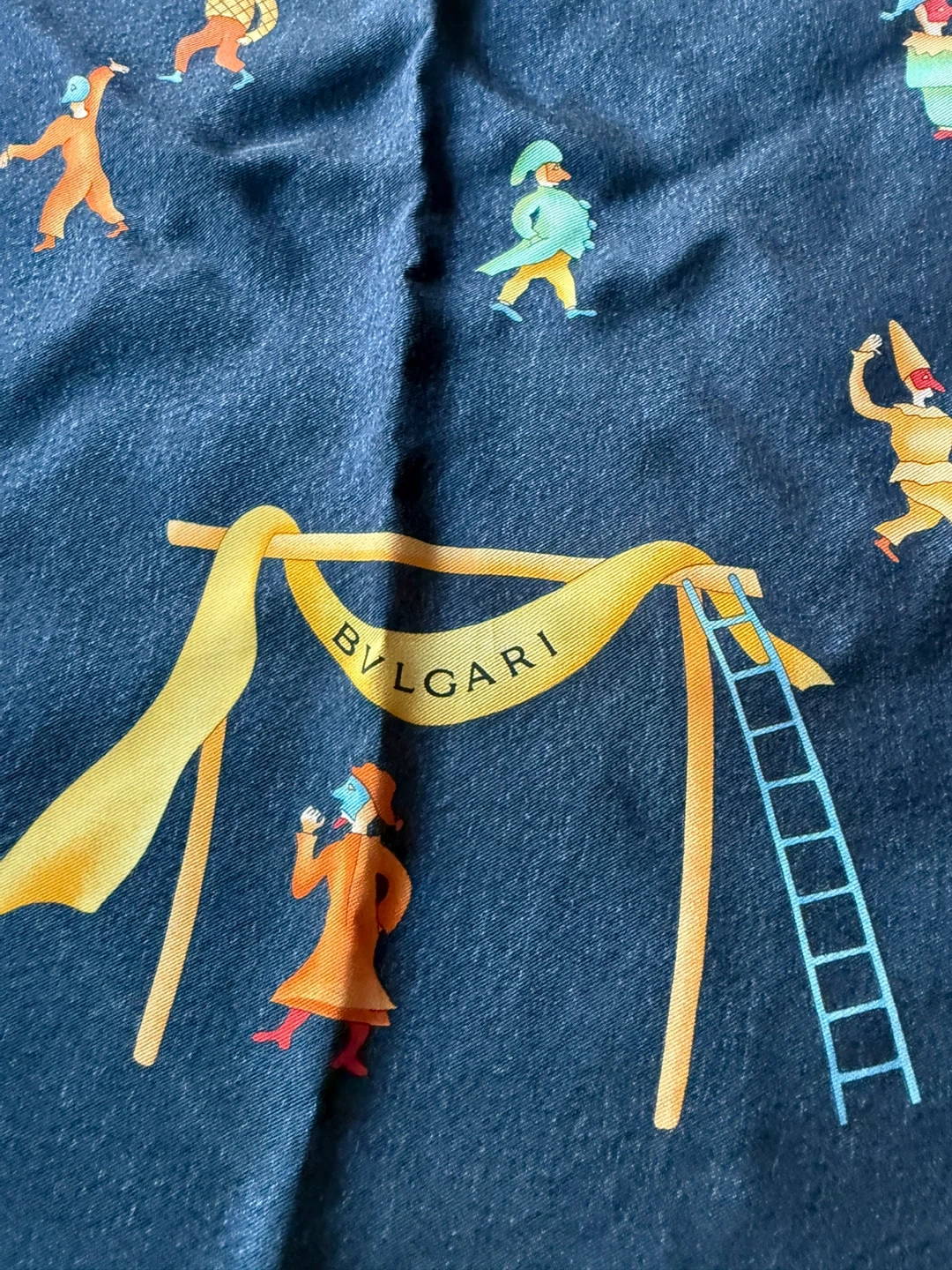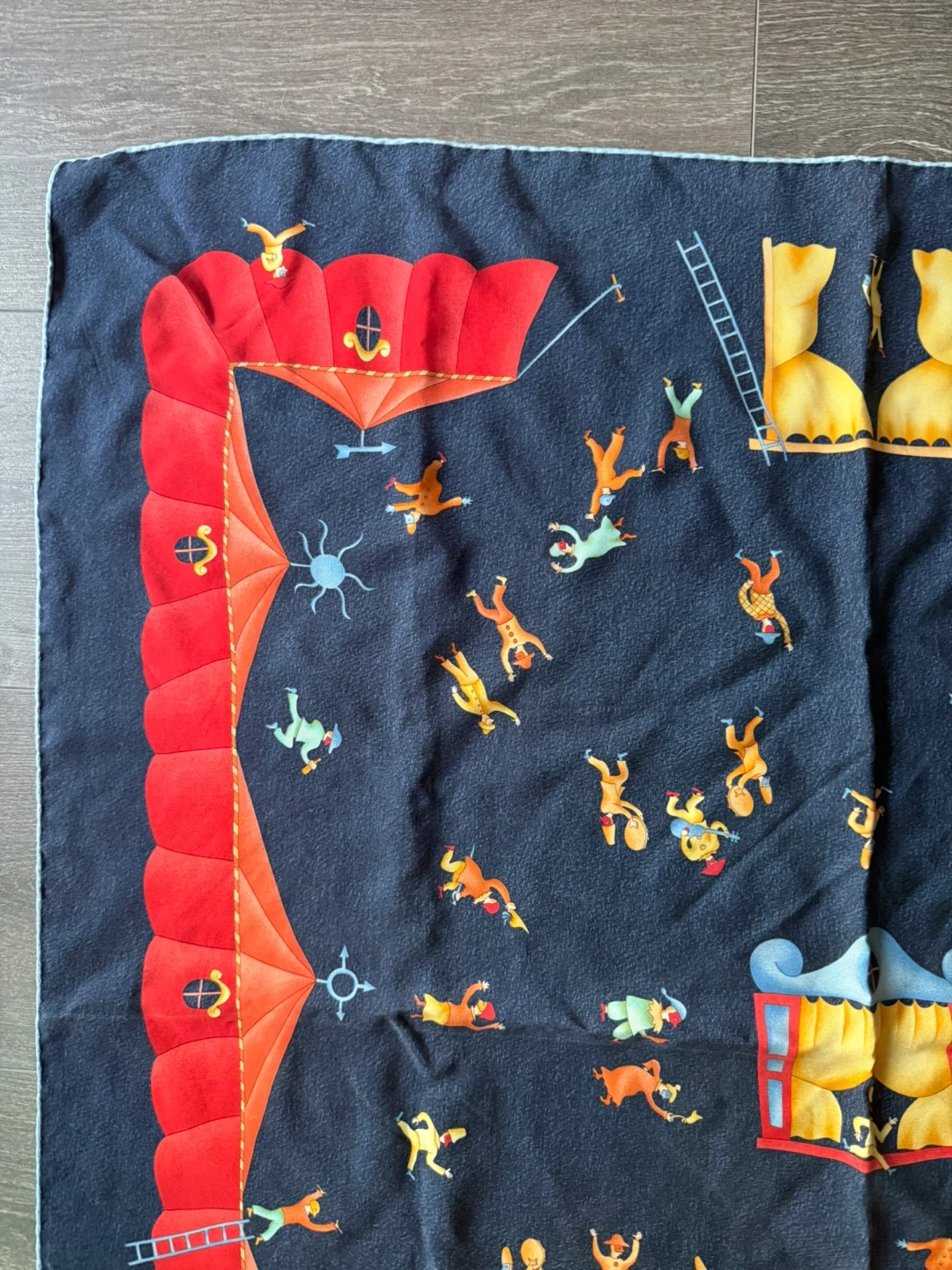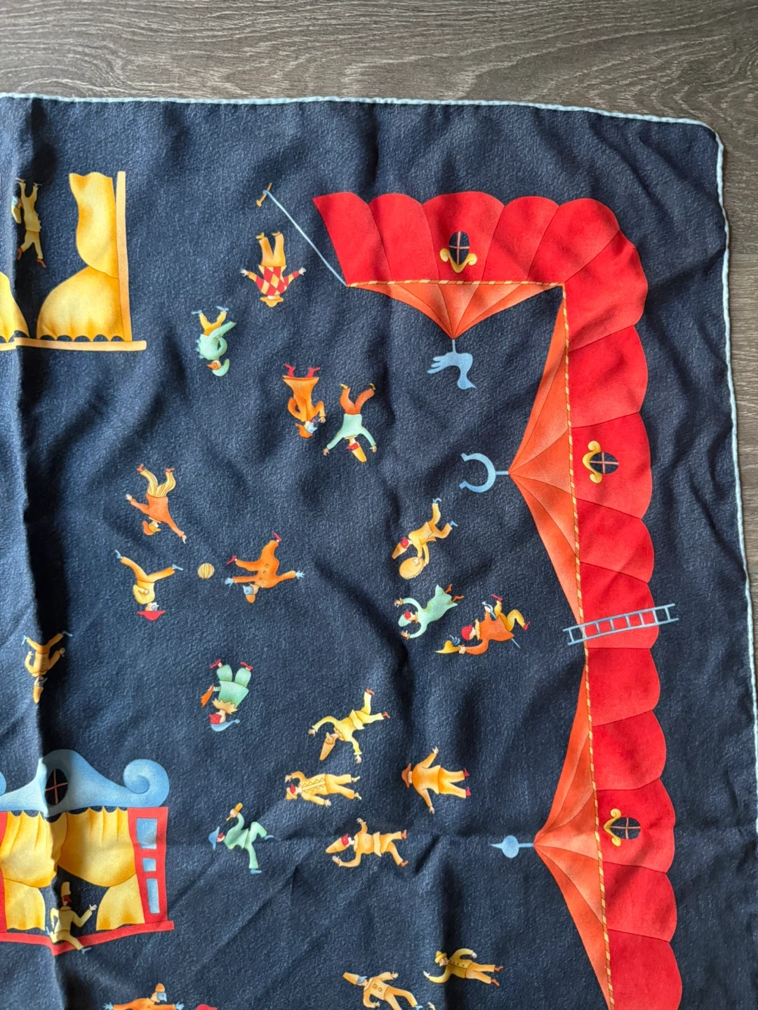 Selling a Bvlgari silk scarf with a unique circus-themed design. The scarf features playful imagery of performers and tents. It's in good condition and ready to add a touch of whimsy to your wardrobe!