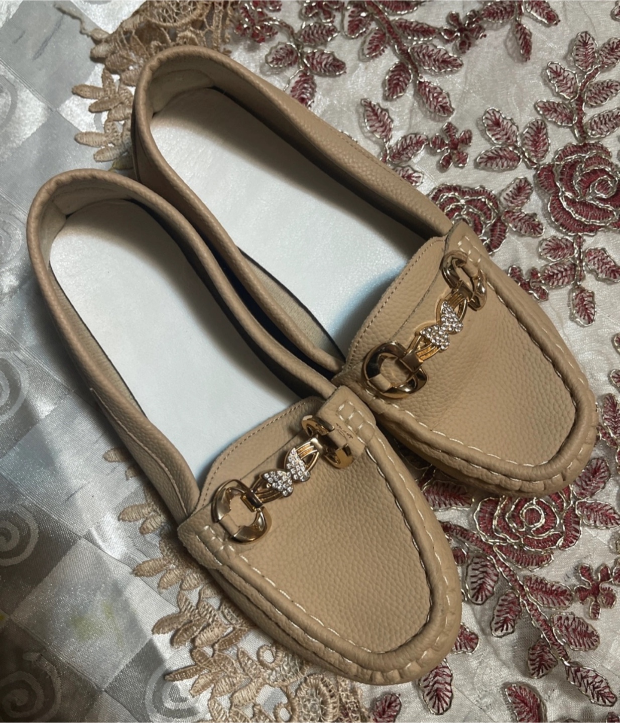 These are a comfy pair of beige loafers! They feature a gold-tone detail on the top. Perfect for everyday wear and adding a touch of elegance to your outfit