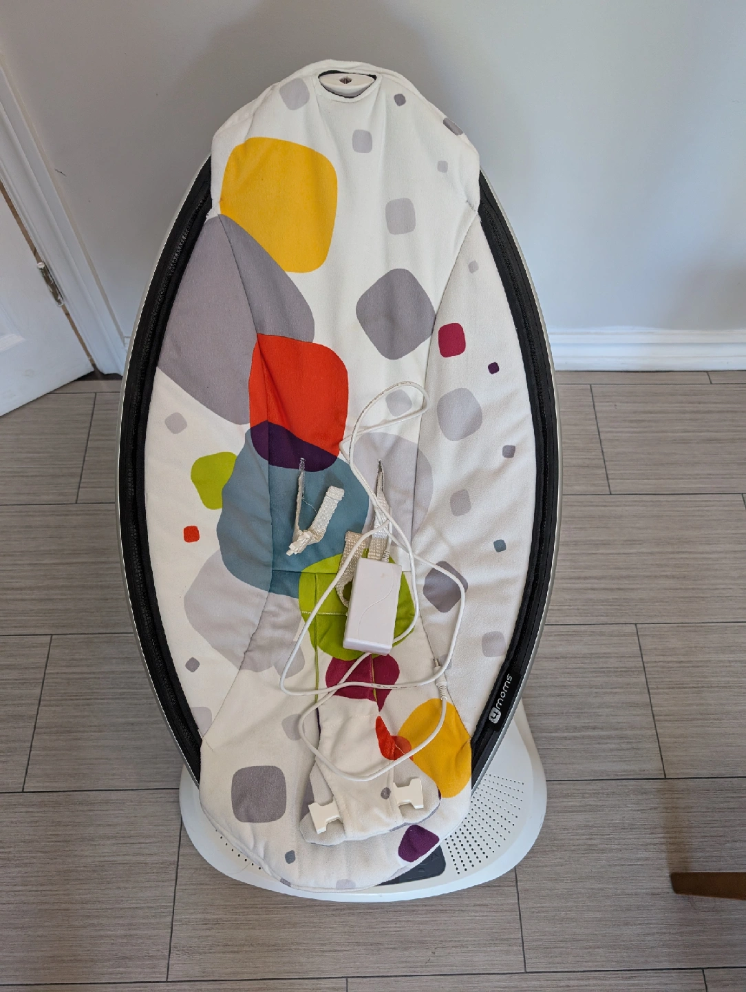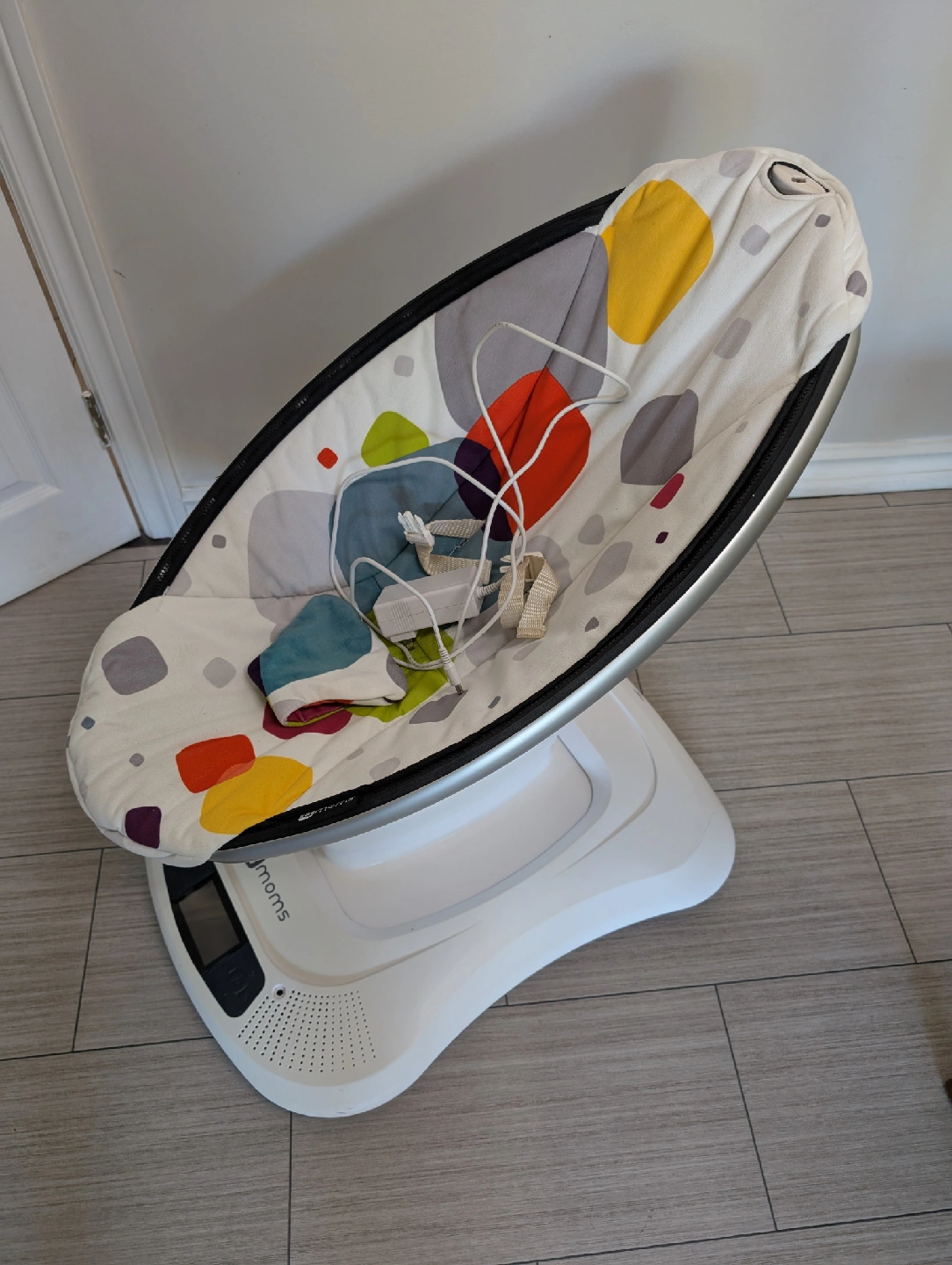 Selling a gently used 4moms MamaRoo baby swing. It's in good condition and has been well taken care of. This swing is designed to mimic the natural motions parents use to comfort their babies. It features multiple speeds and built-in sounds to soothe your little one. Perfect for keeping baby happy and content!