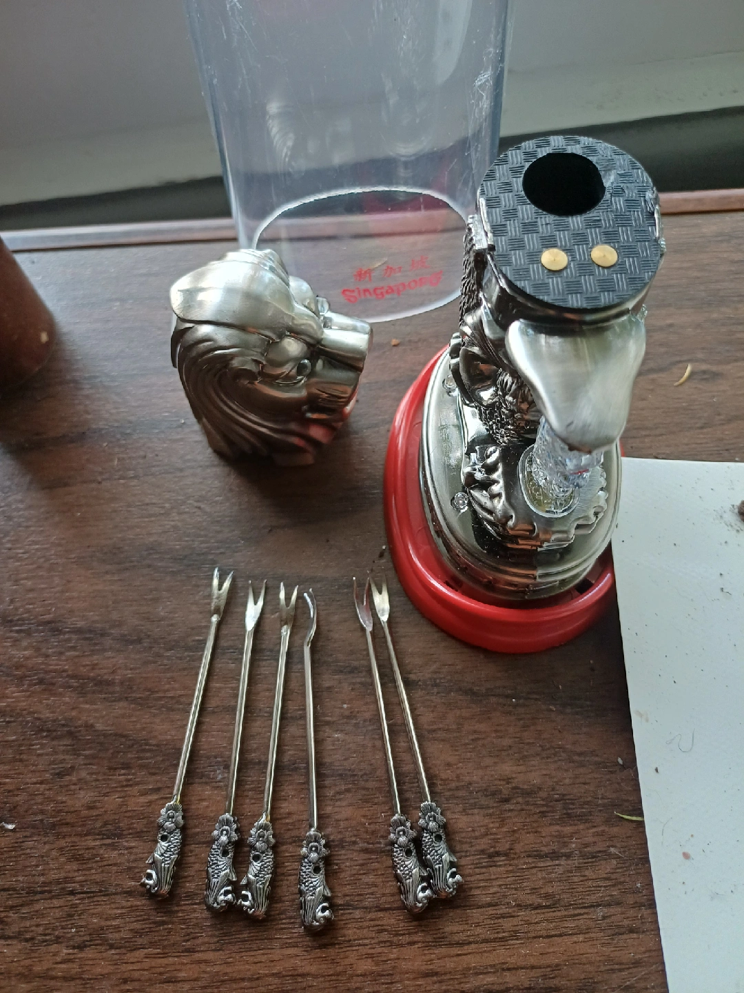 Pewter replica of Singapore's Merlion, the head detaches revealing a set of six cocktail forks, each is decorated with a small Merlion on the handle.
