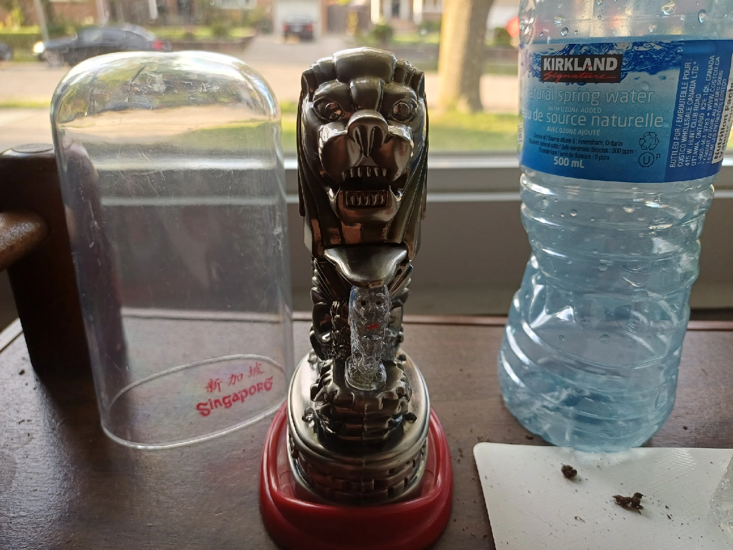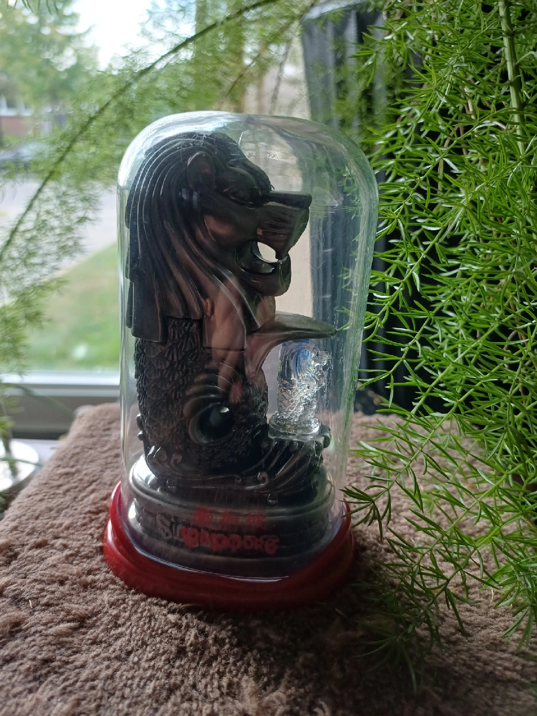 The base has a battery compartment, when switched on, lights up the Merlion's green eyes.