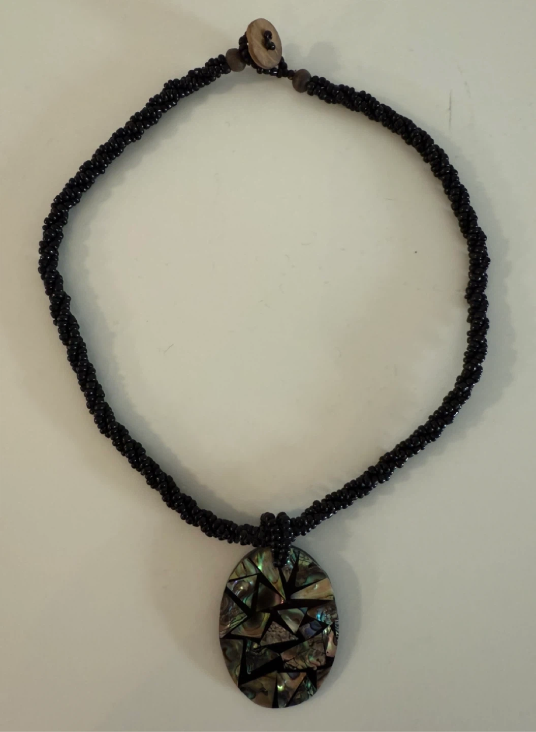 Unique beaded necklace featuring an oval abalone shell pendant with mosaic design.