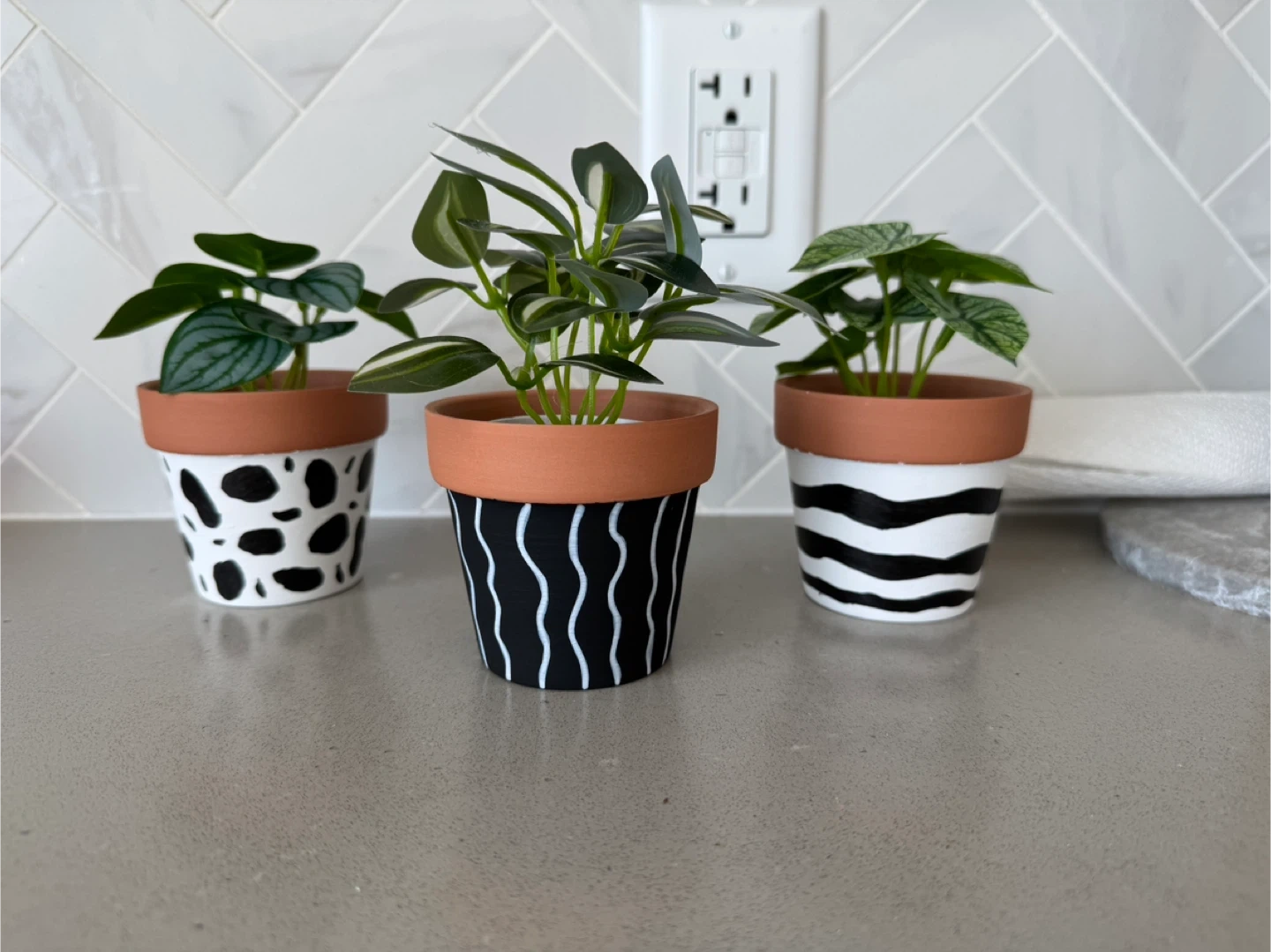 Selling a set of three hand-painted terracotta plant pots!They each have a unique black and white design: one with zebra stripes, one with cow spots, and one with wavy lines. The terracotta plant posts come with a set of three artificial plants.