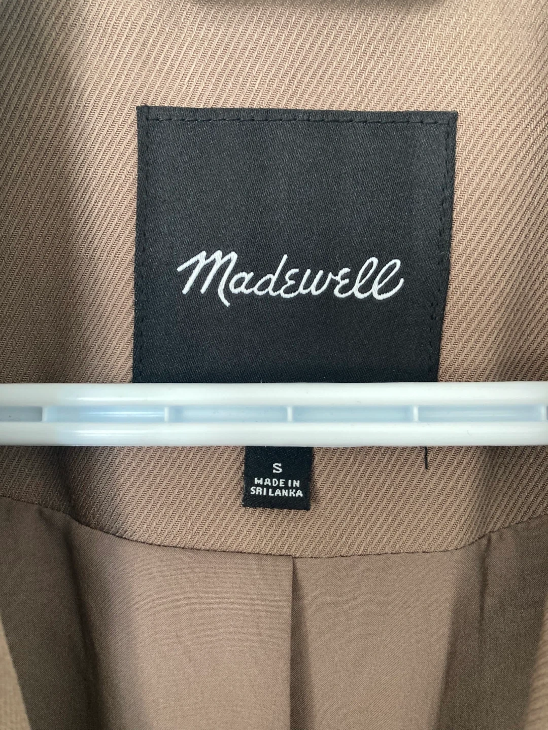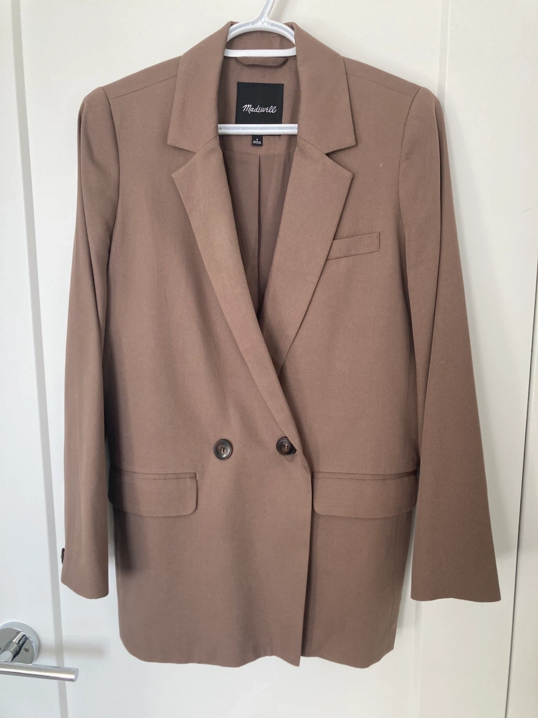 Here's a Madewell blazer in size small! It's a lovely neutral colour that goes with just about anything. The material feels great and it's in excellent condition. Perfect for adding a touch of sophistication to any outfit!