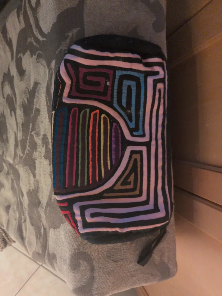 This is a unique mola pouch featuring a colourful geometric design! It's in great shape and perfect for carrying small items