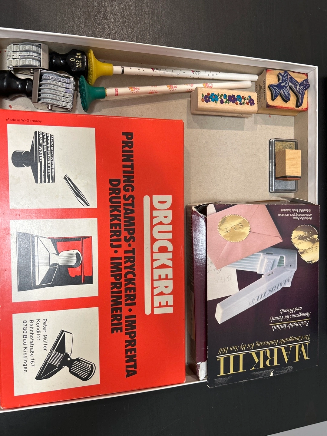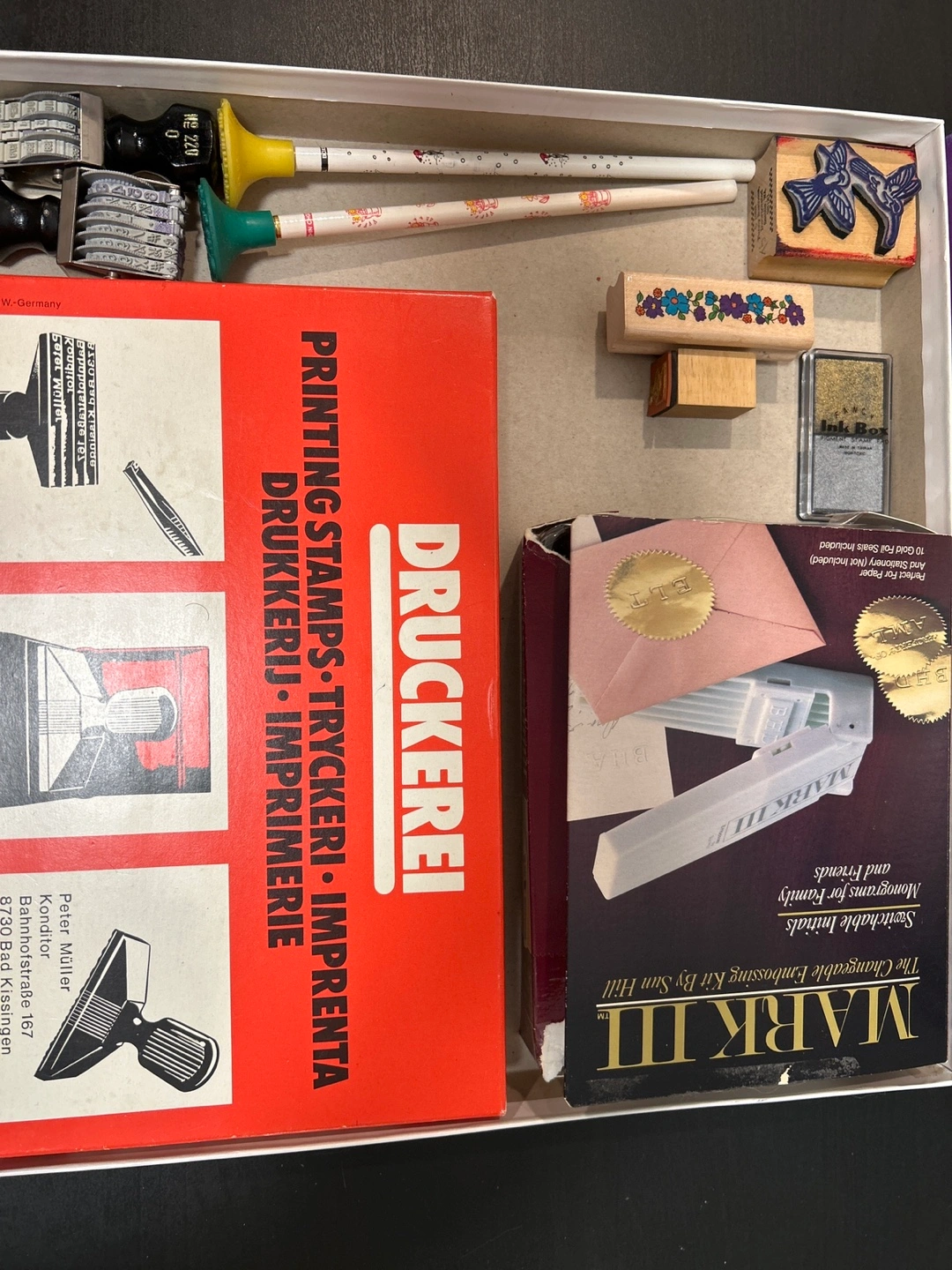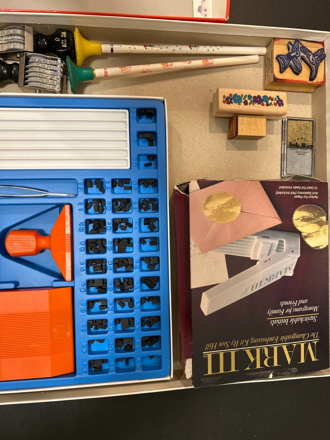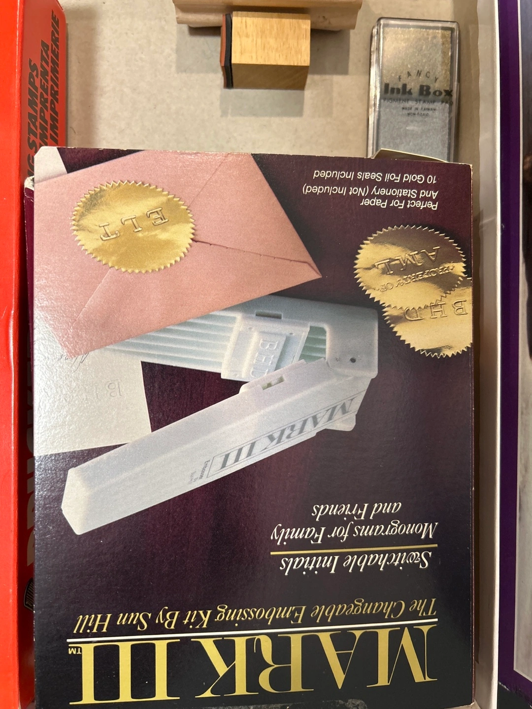 This is The Mark III Changeable Initials Embossing Kit by Sue Hill. It's for monograms for family and friends. Includes a selection of stamps and an ink box. Some gold foil seals are also included.