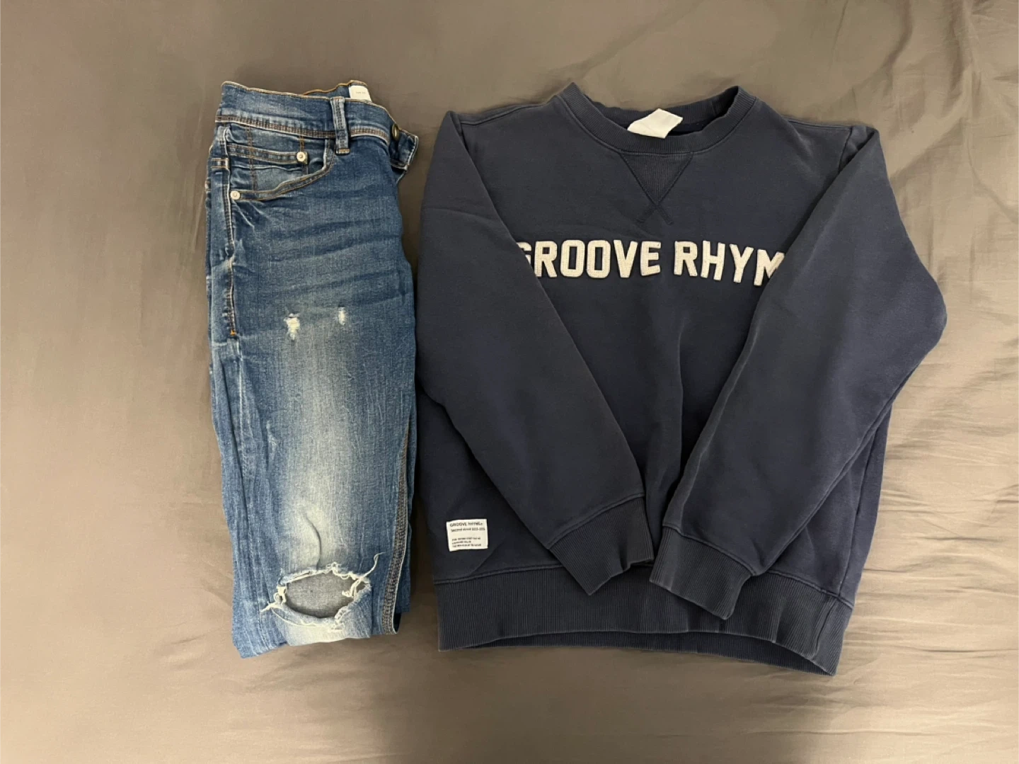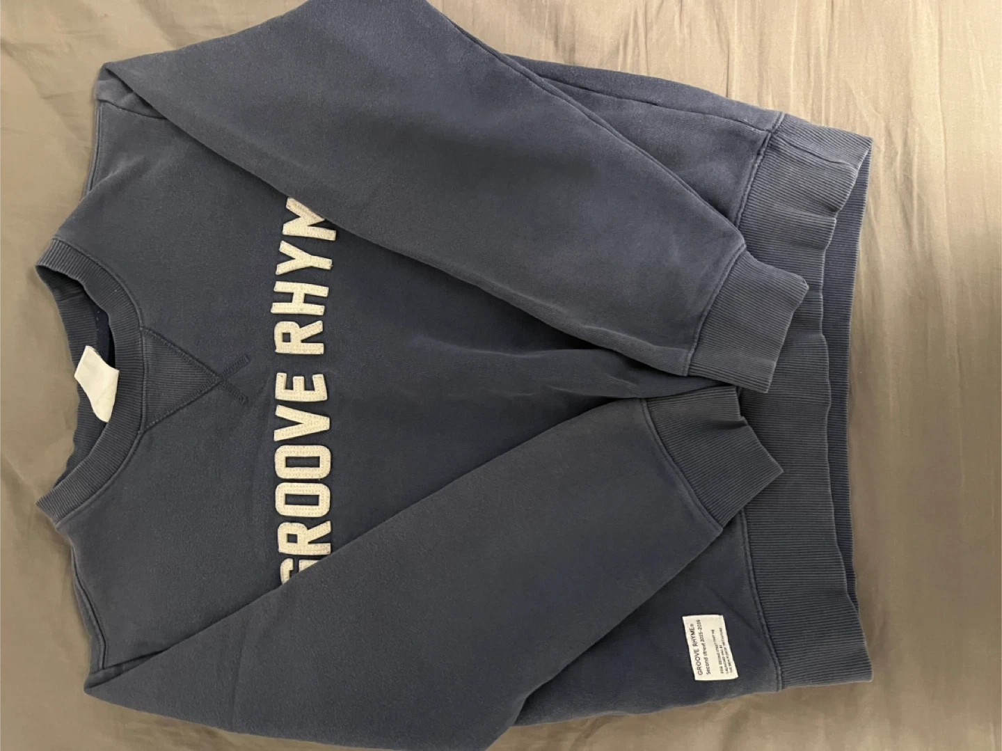 This is a blue sweatshirt with "GROOVE RHYME" printed vertically on the front. It's a crewneck style with ribbed cuffs and hem. This would be a comfy addition to casual wear!