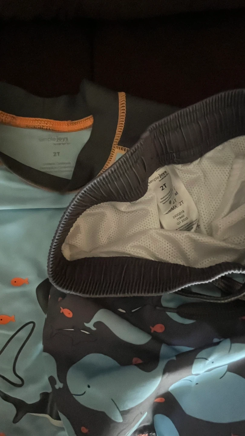 Cute Simple Joys swim set in size 2T! The top features a fun shark design, and the shorts have a whale pattern. Perfect for a day at the beach or pool!