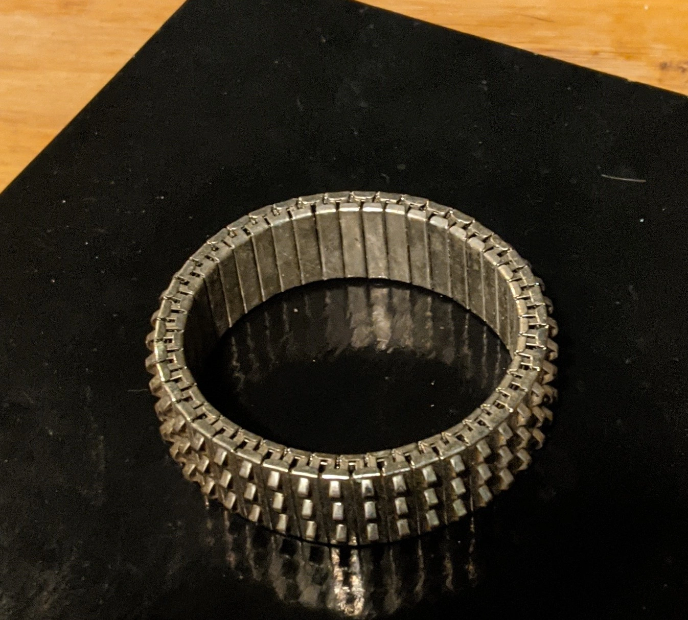 39Selling a silver tone stretch bracelet. It is in good condition and would be a great addition to your jewelry collection! There is over 120 loops for hanging charms beads etc