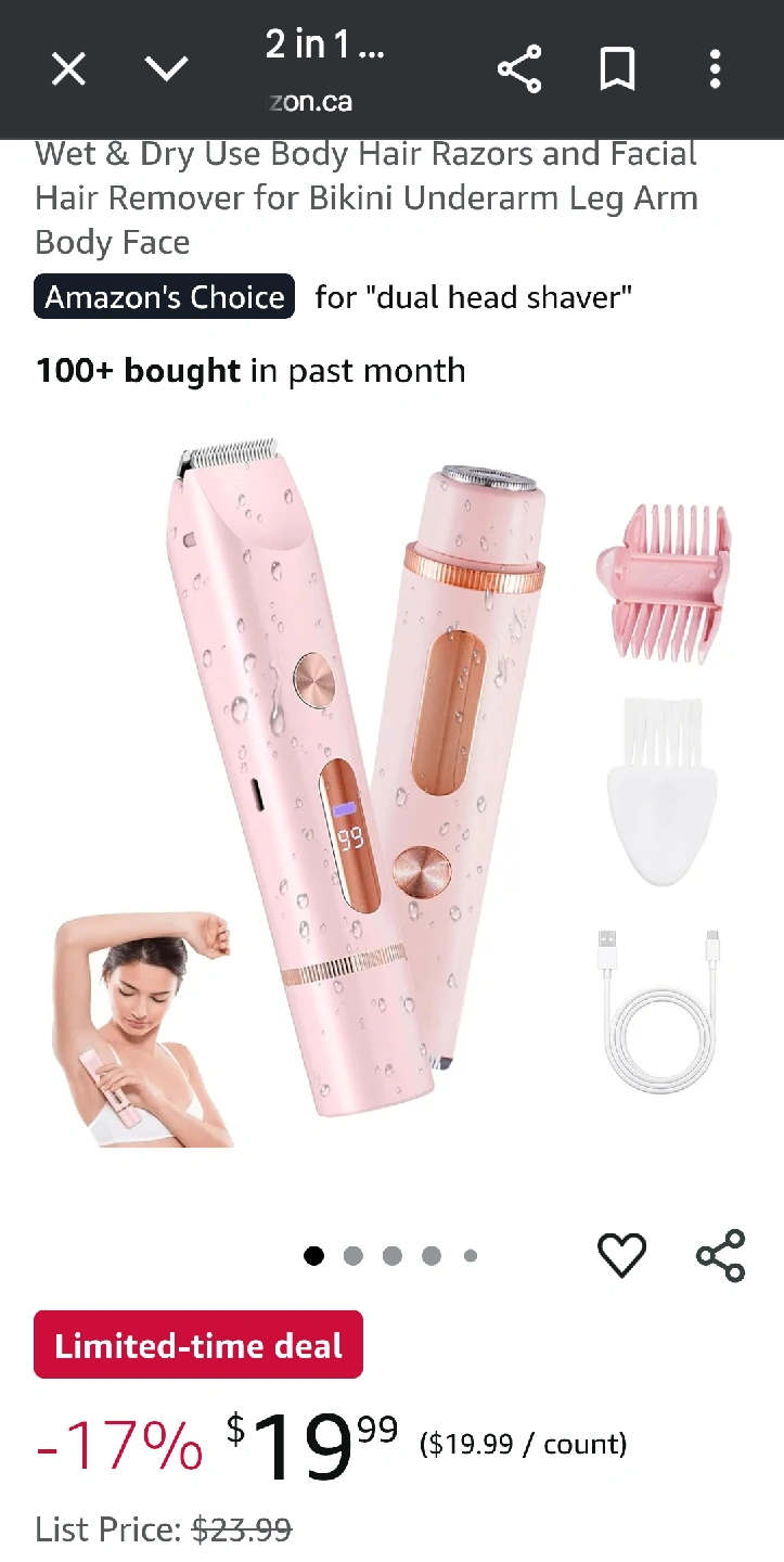I'm selling a 2 in 1 wet & dry body hair razor and facial hair remover. It's great for bikini, underarm, leg, arm, body, and face hair removal. It's an Amazon's Choice product for dual head shavers. The list price is $23.99, but it's currently on sale for $19.99!