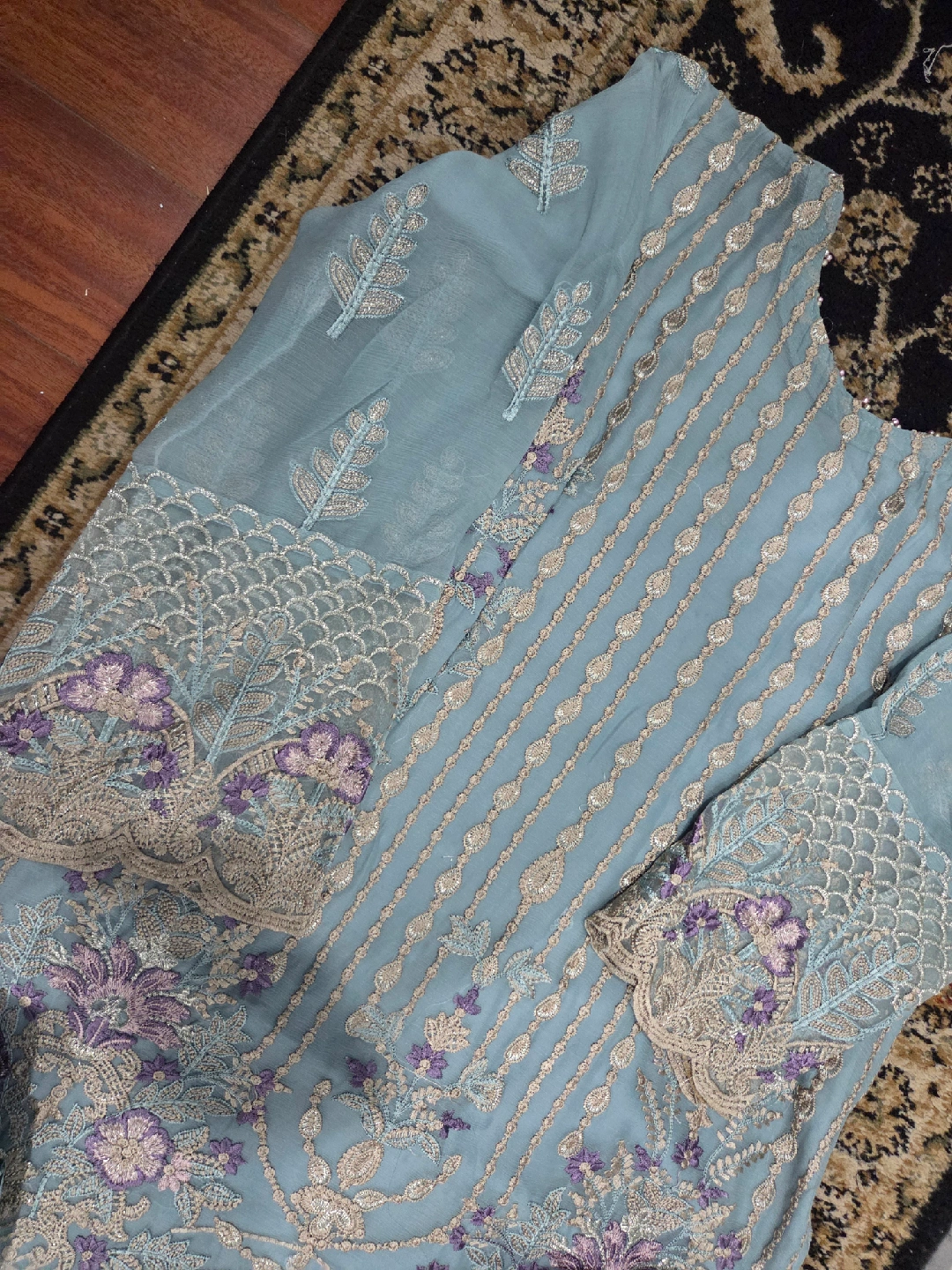 15Beautiful embroidered dress with a floral pattern in shades of blue and purple. The intricate detailing and delicate lace trim add a touch of elegance. Perfect for a special occasion or a stylish everyday look!