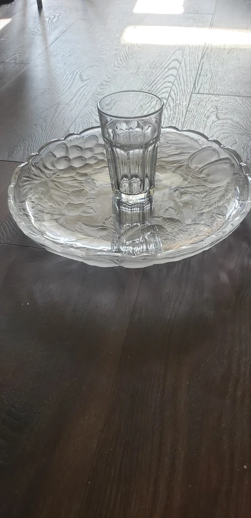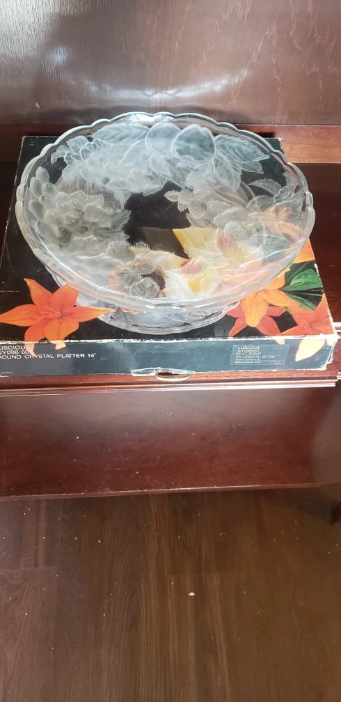 Selling a beautiful Luscious Crystal Platter. It's a 14-inch round platter with a lovely floral design. It comes in its original box, perfect for adding a touch of elegance to your table!