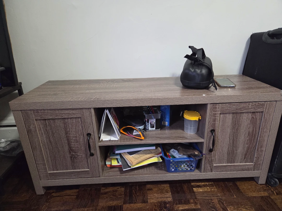 Selling a wood entertainment unit, perfect for your TV and media storage needs! It features two side cabinets with doors and an open shelf in the middle. It's In a very good condition and ready to find a new home