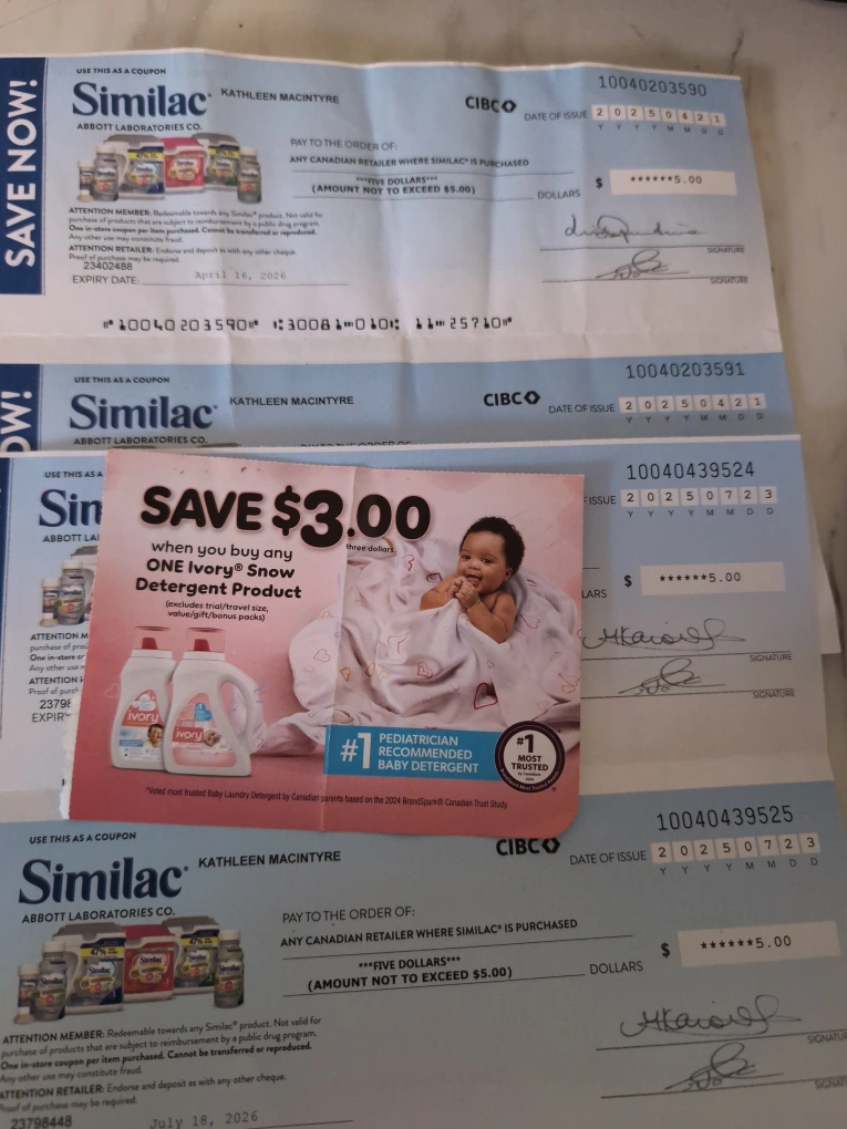 I have a few coupons available: - Similac: $5 off any Similac product. Expires April 16, 2026 - Ivory Snow Detergent: $3 off one Ivory Snow Detergent product. Expires July 18, 2026 Great way to save on baby essentials! Pickup only St Clair East and O'Connor