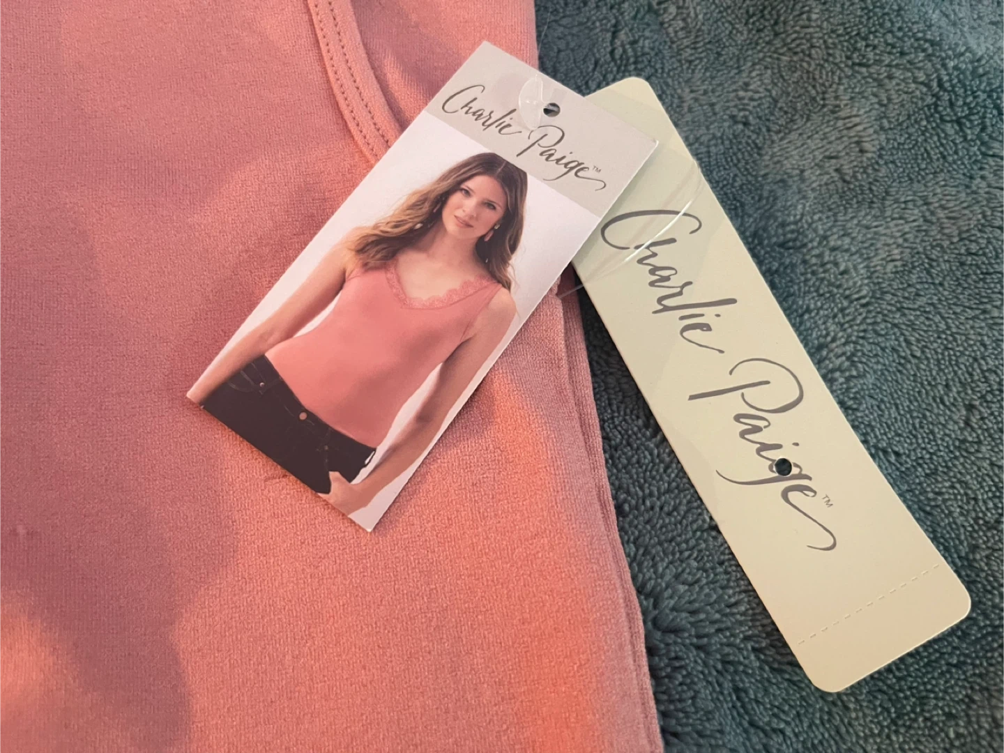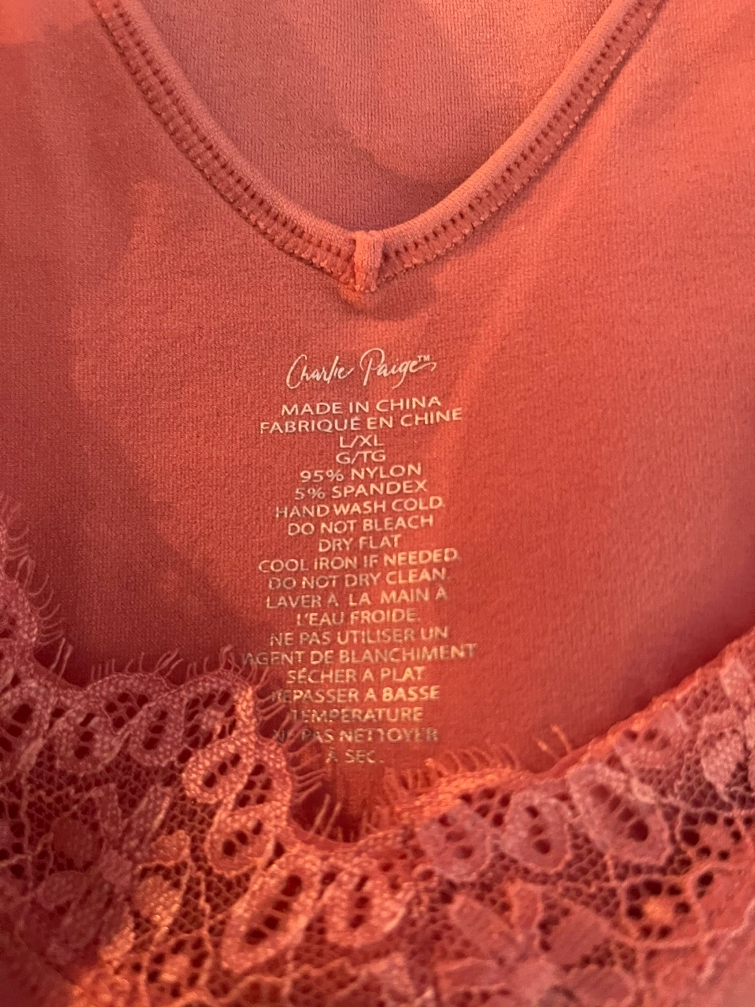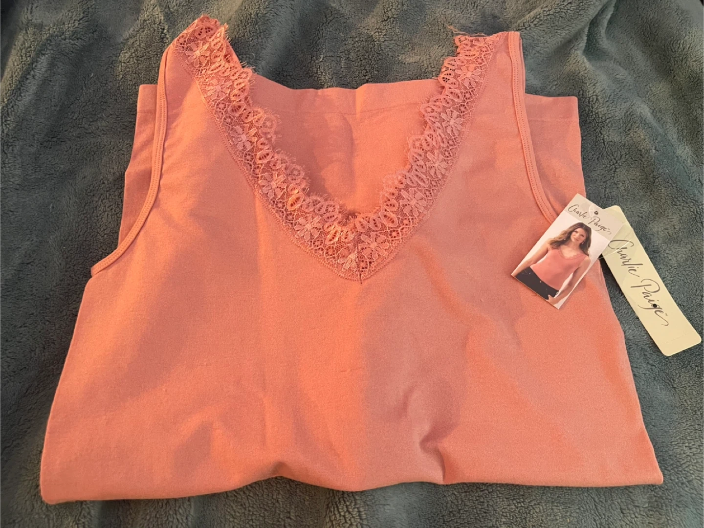 This is a brand new Charlie Paige reversible top! It's a lovely coral colour with lace detailing around the V-neck. The tag says it originally retailed for $19.99 plus tax. Got as a gift not my style. Lobby Pick up.