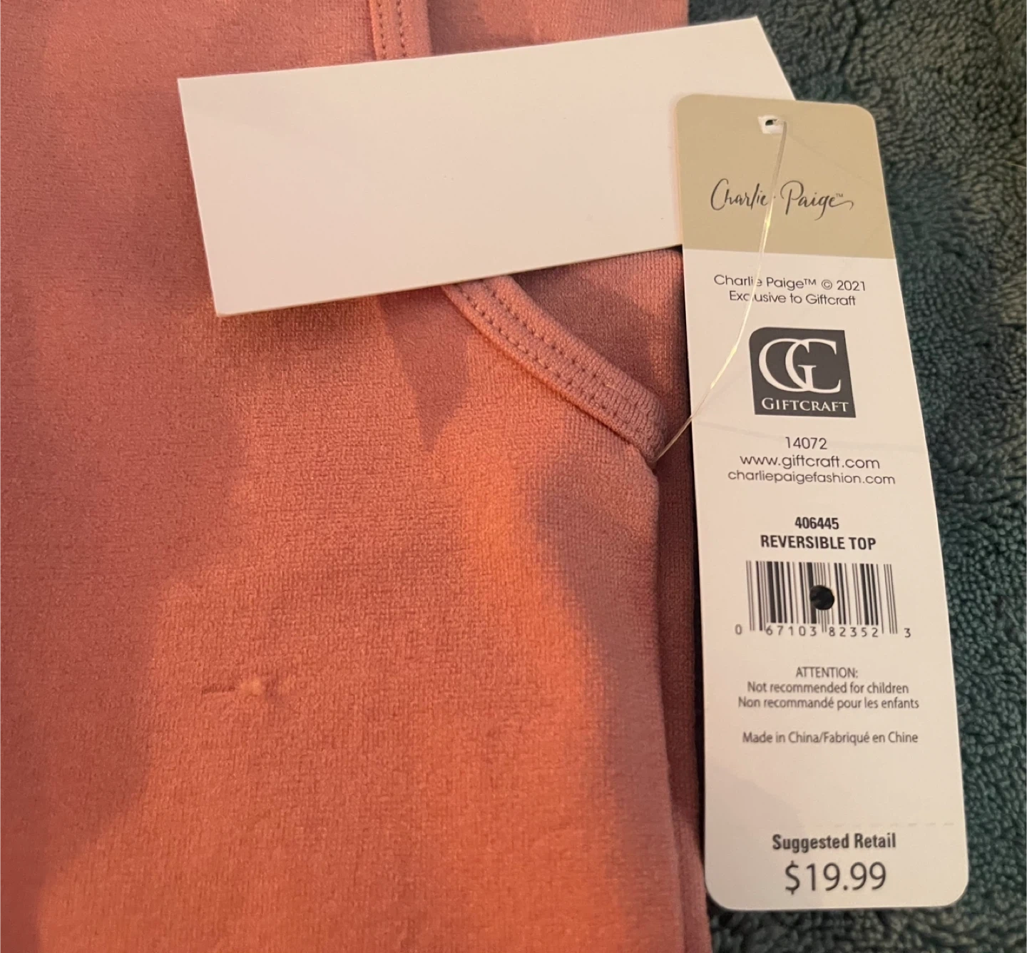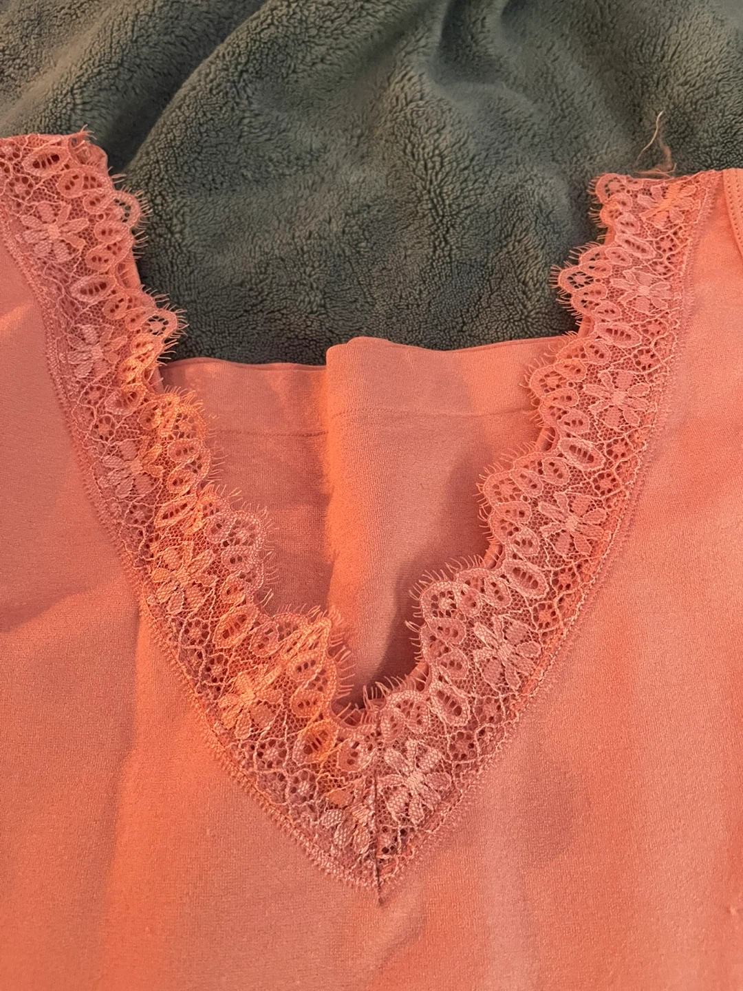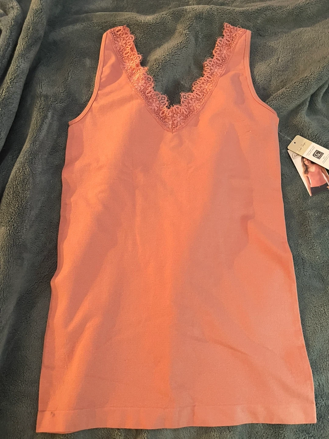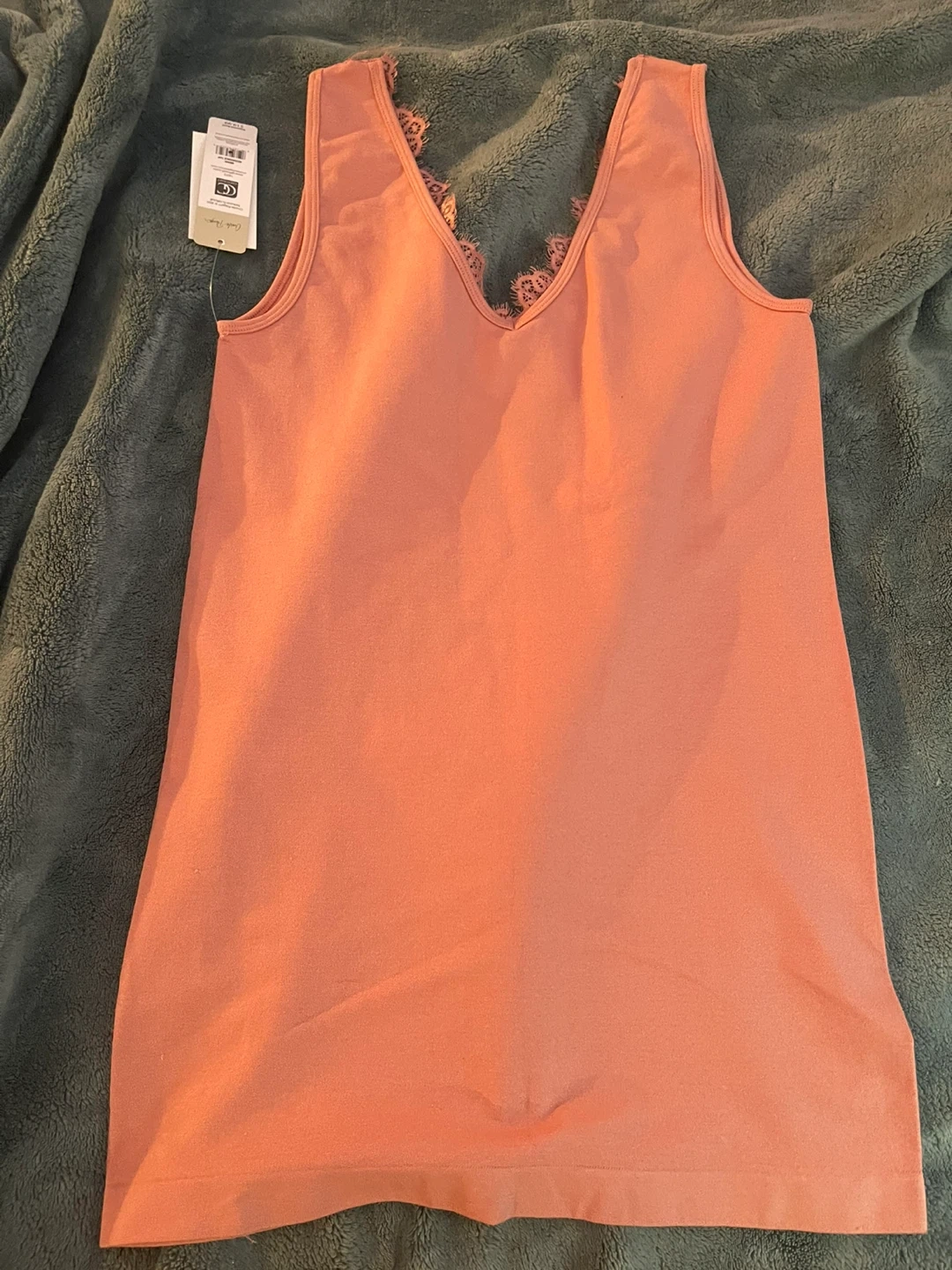 This is a brand new Charlie Paige reversible top! It's a lovely coral colour with lace detailing around the V-neck. The tag says it originally retailed for $19.99 plus tax. Got as a gift not my style. Lobby Pick up.