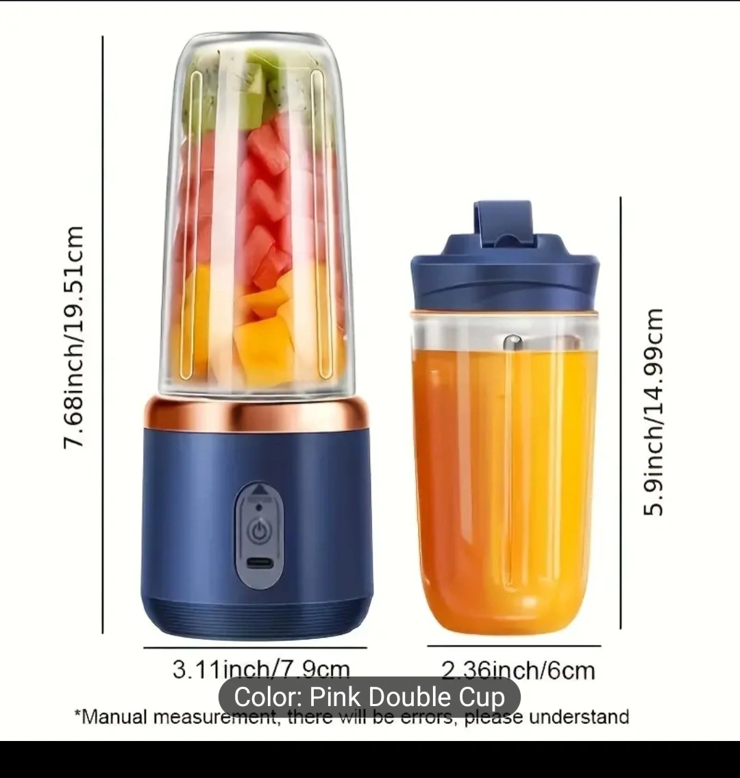 I'm selling a portable blender that comes with a double cup. It's perfect for making smoothies or shakes on the go! The blender is pink and easy to use. Dimensions are approximately 7.68 inches tall and 3.11 inches wide.