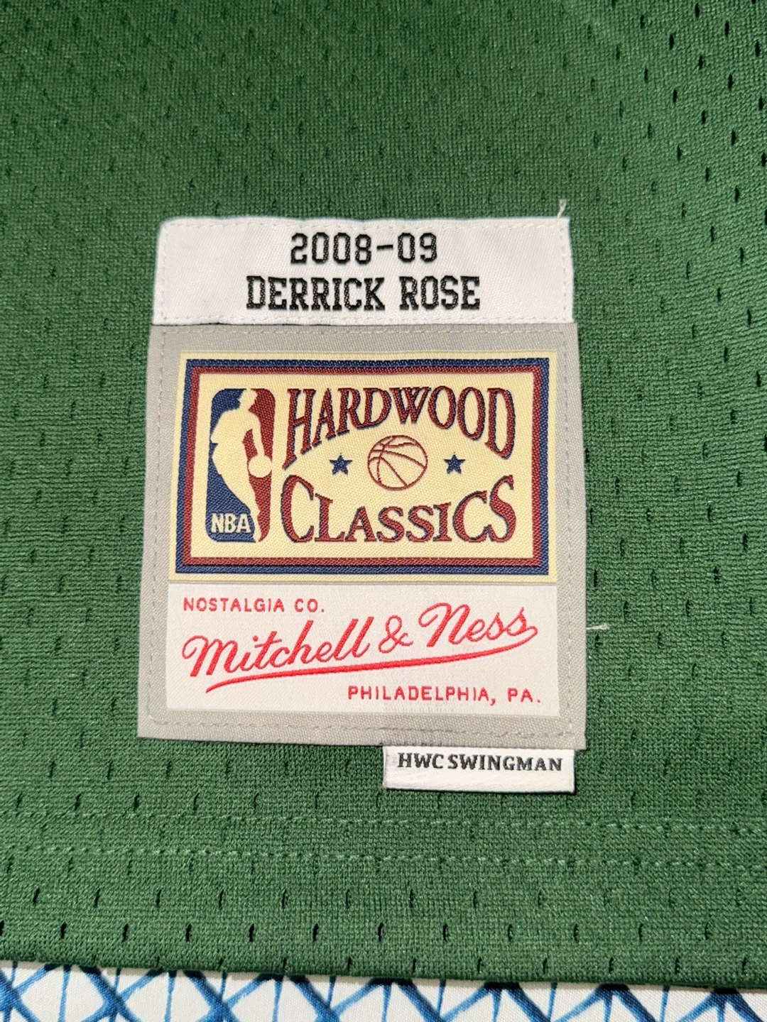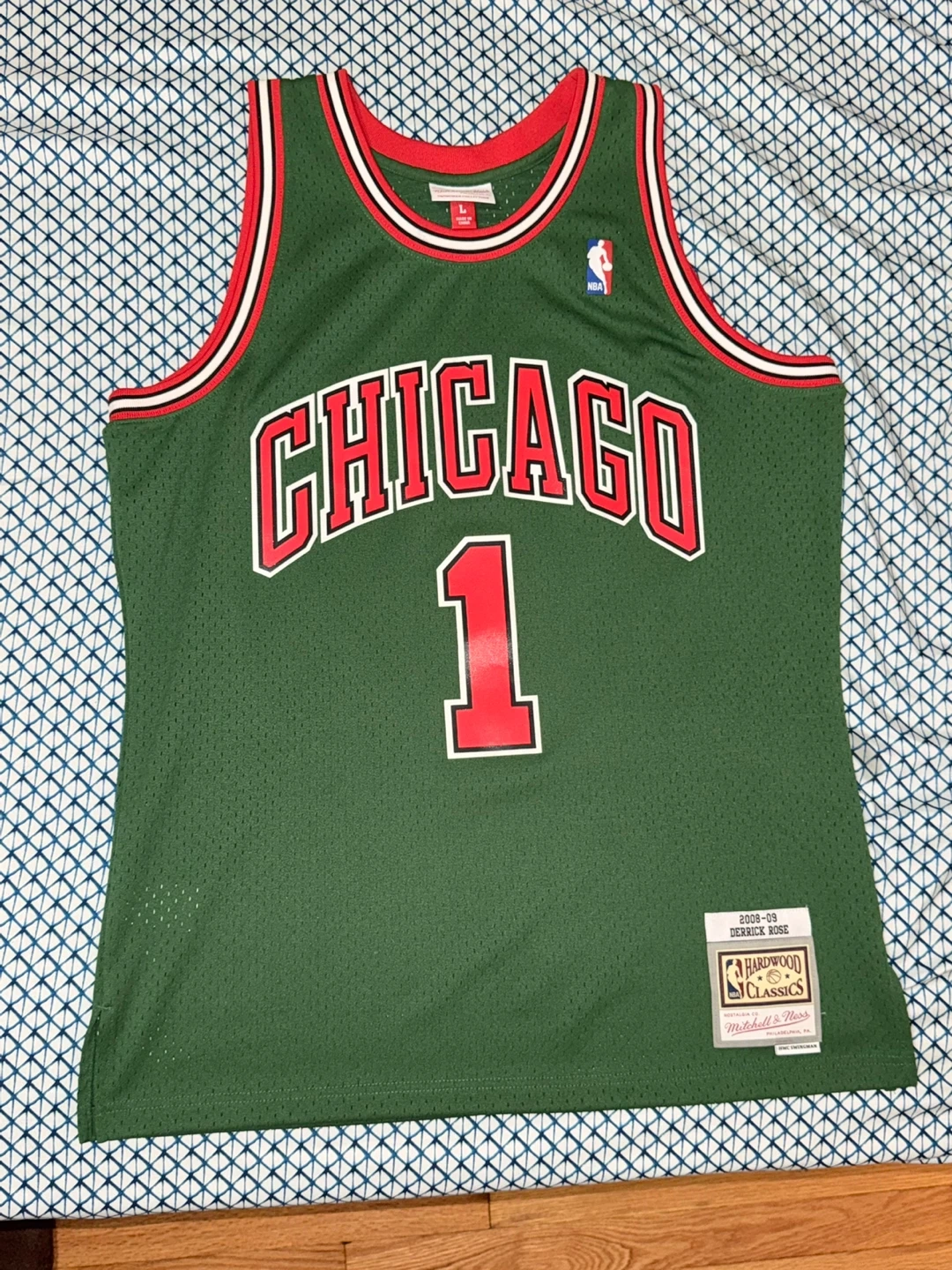 Selling a Mitchell & Ness Derrick Rose Chicago Bulls jersey. It's green with red and white trim. The jersey is part of the Hardwood Classics collection and is a HWC Swingman. It features Rose's name and number 1 on the back. Size is L.