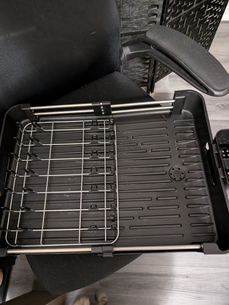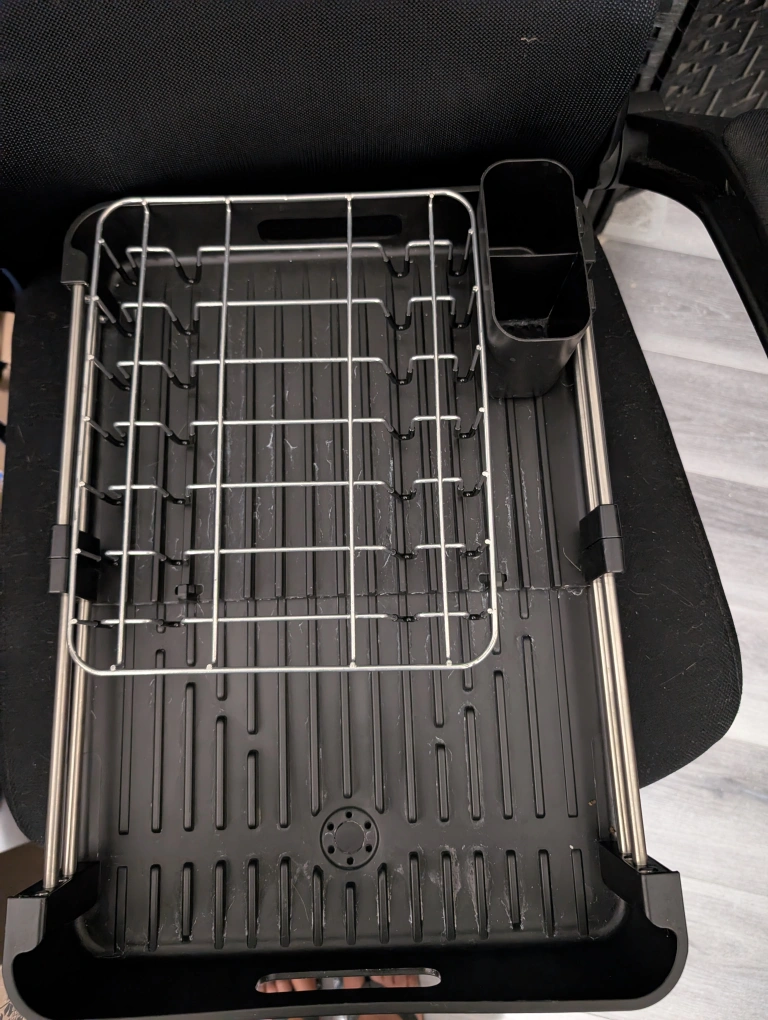 Black expandable dish drying rack. It's in great condition and ready to help keep your kitchen organized! It expands to fit more dishes. Perfect for small spaces. Includes cutlery drain.