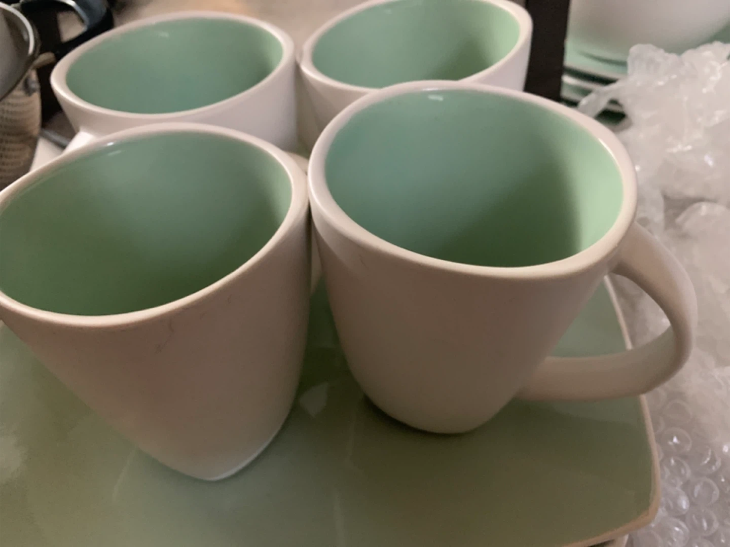 Dishes set for sale! Includes plates, bowls, and cups. The interior colour is a mint green colour. Never used!