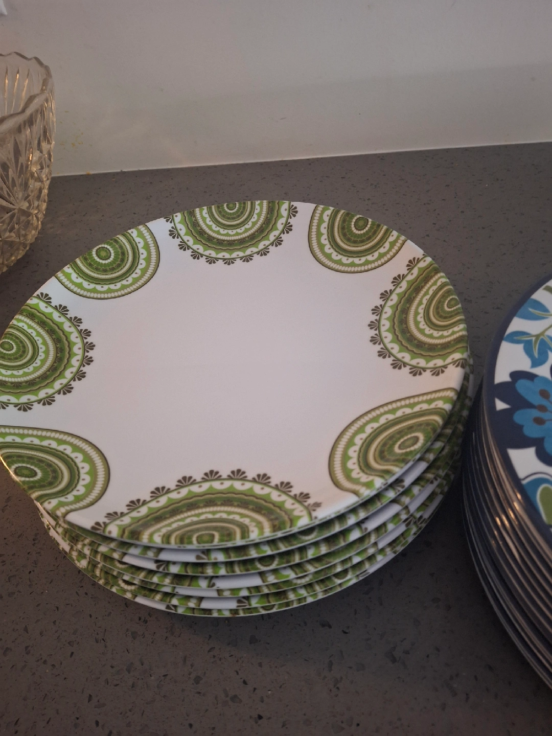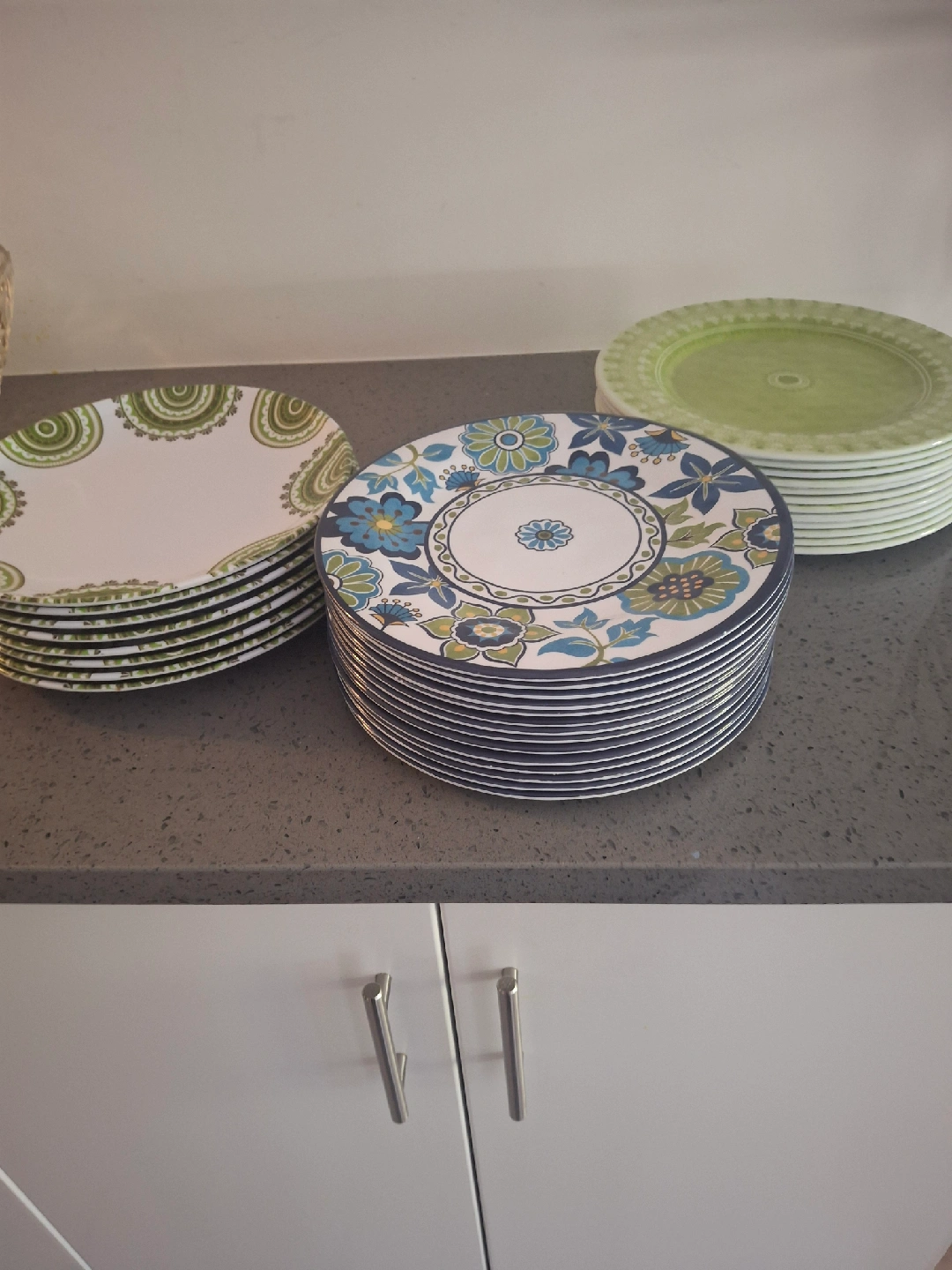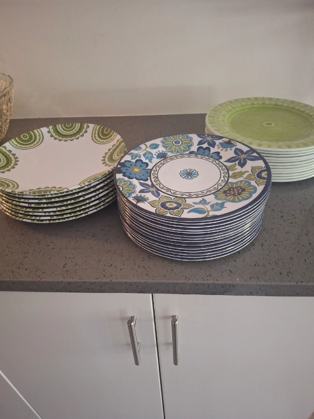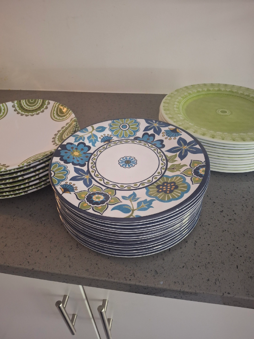 KSP Madrid dinnerware. purchased from Kitchen Stuff Plus. All plates are BPA free. 34 plates in total. The blue plates are on clearance right now for $2.99 each. I purchased for $5.99 each- 27cm Diameter. The other plates are larger. 14- blue, 12- green, 8- white and green.