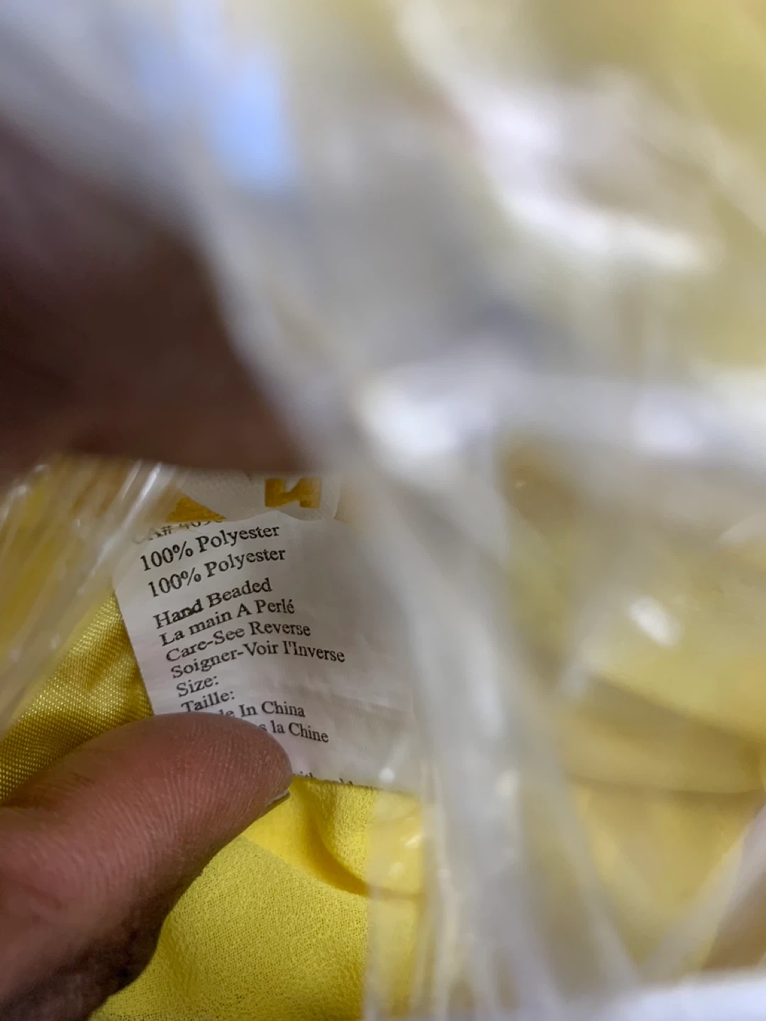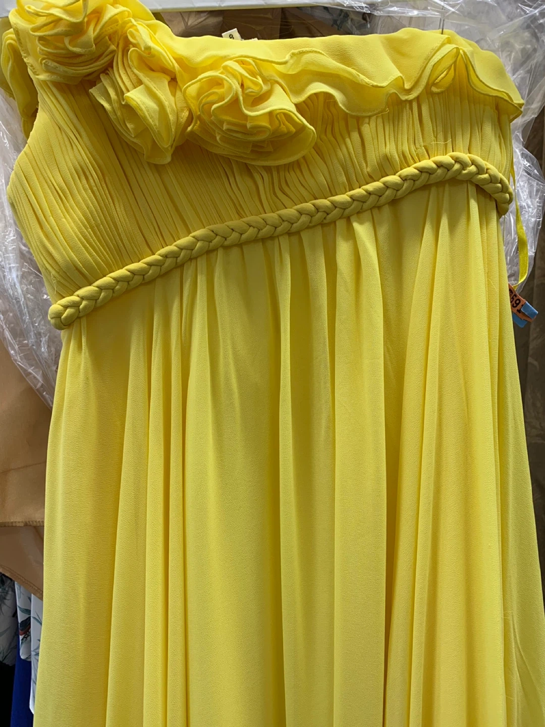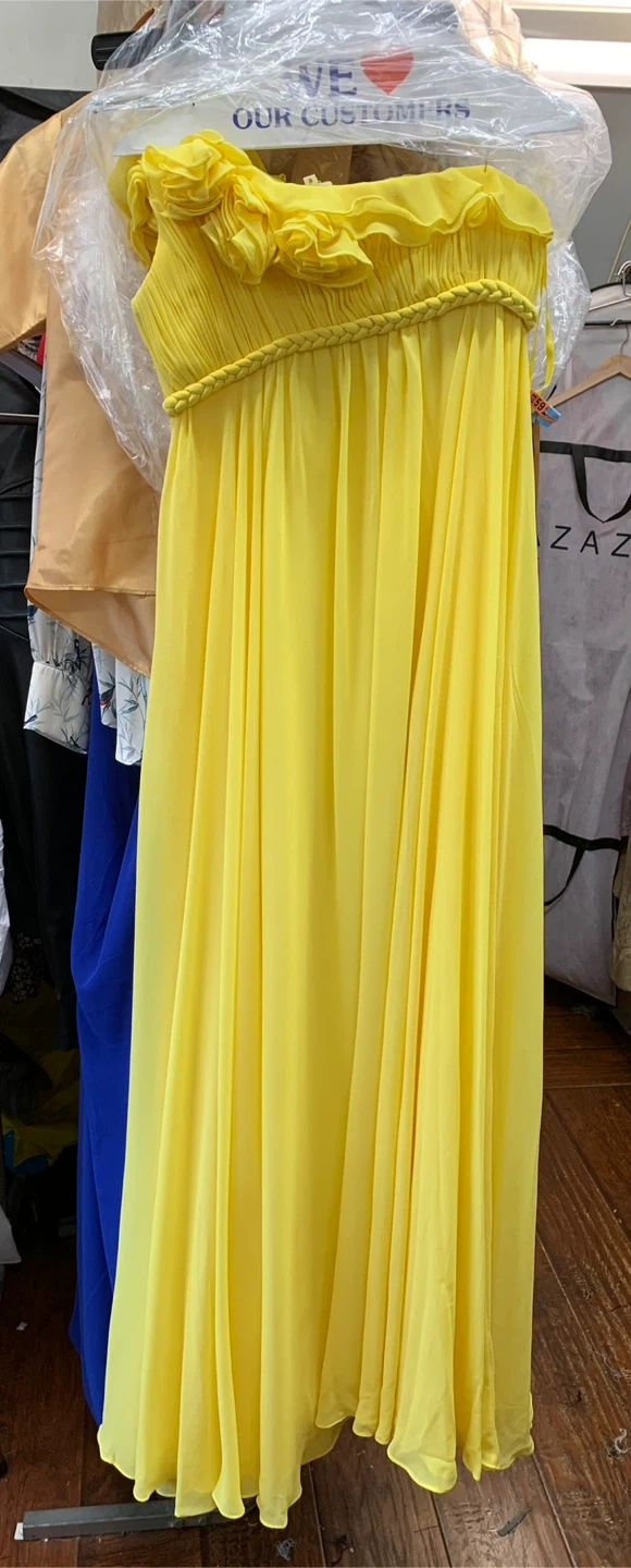 Selling a beautiful yellow dress in size 8. It's made of 100% polyester and features hand-beaded detailing. Perfect for a special occasion!