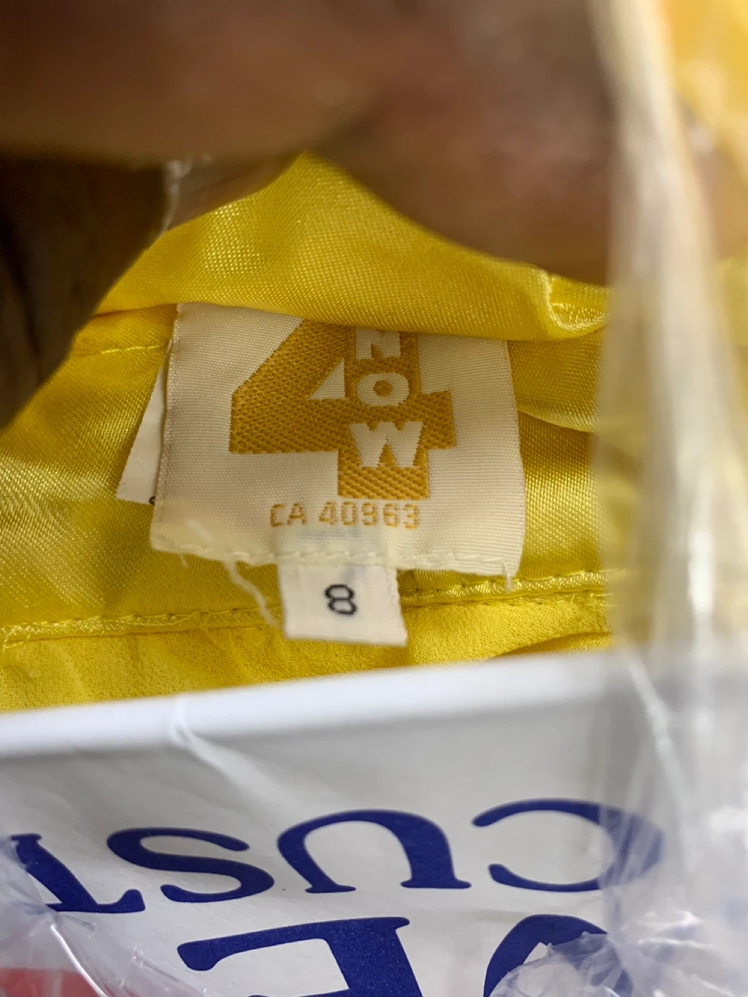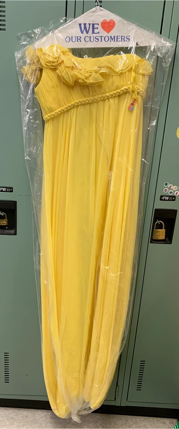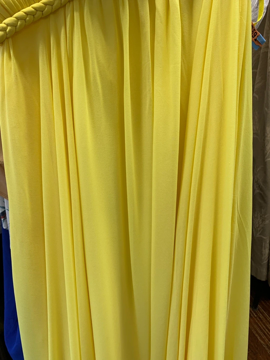 Selling a beautiful yellow dress in size 8. It's made of 100% polyester and features hand-beaded detailing. Perfect for a special occasion!