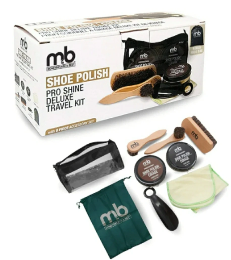 brand new in box never opened. shoe care / leather kit. shoe polish in brown and black, brushes, buffer, shoe horn, bag. paid 28.99 from Canadian Tire before tax.